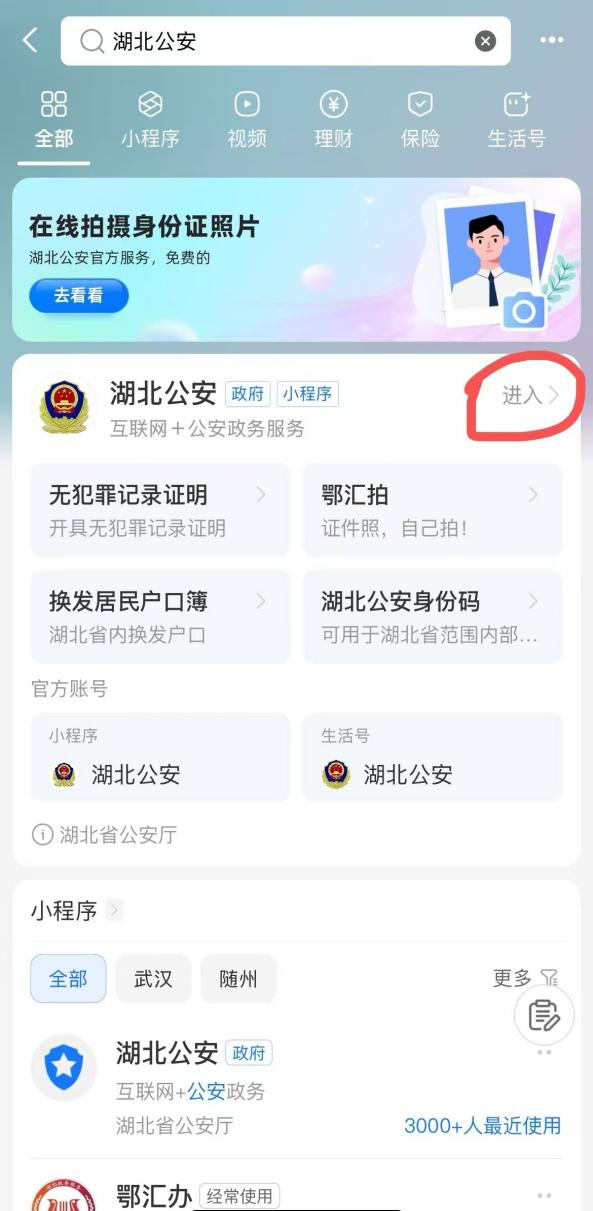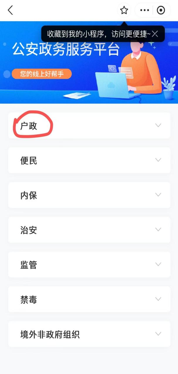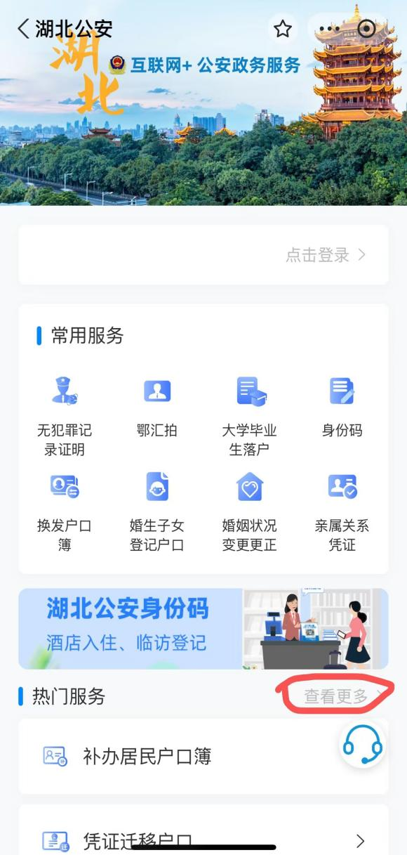 通过搜索“湖北公安”进入小程序,首页“查看更多”,即可在“户政”一栏找到这一事项。