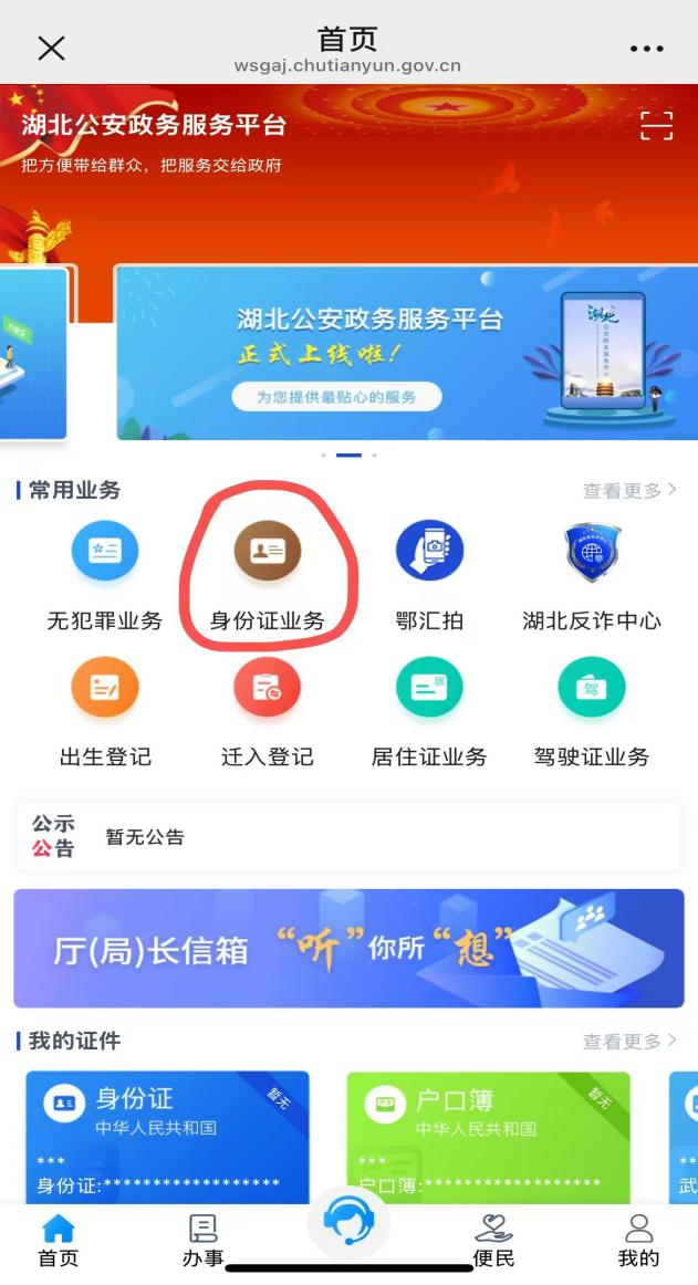 搜索公众号“湖北公安政务服务平台”,点击“微警务”,选择首页的“身份证业务”,即可找到身份证补领业务。