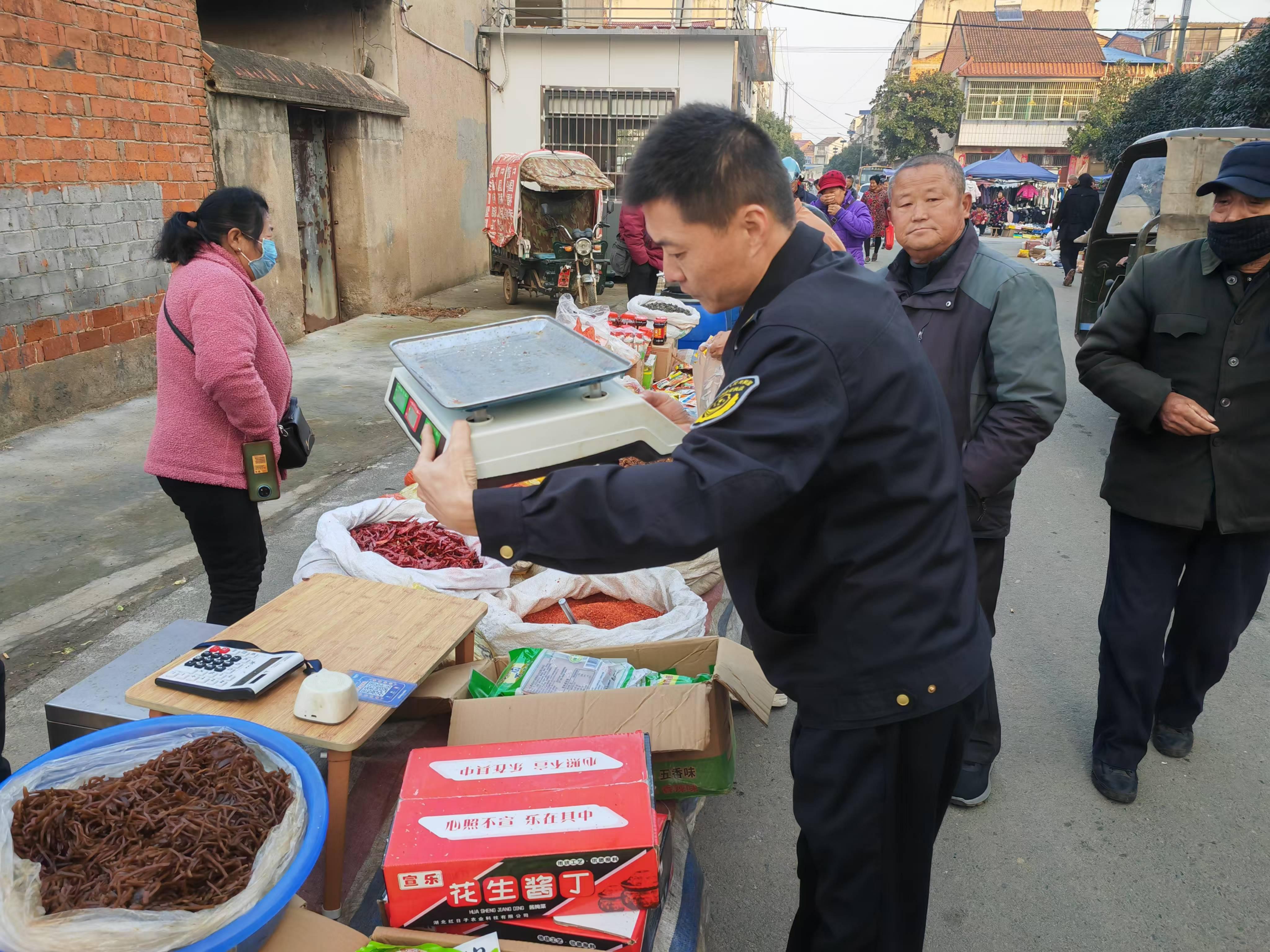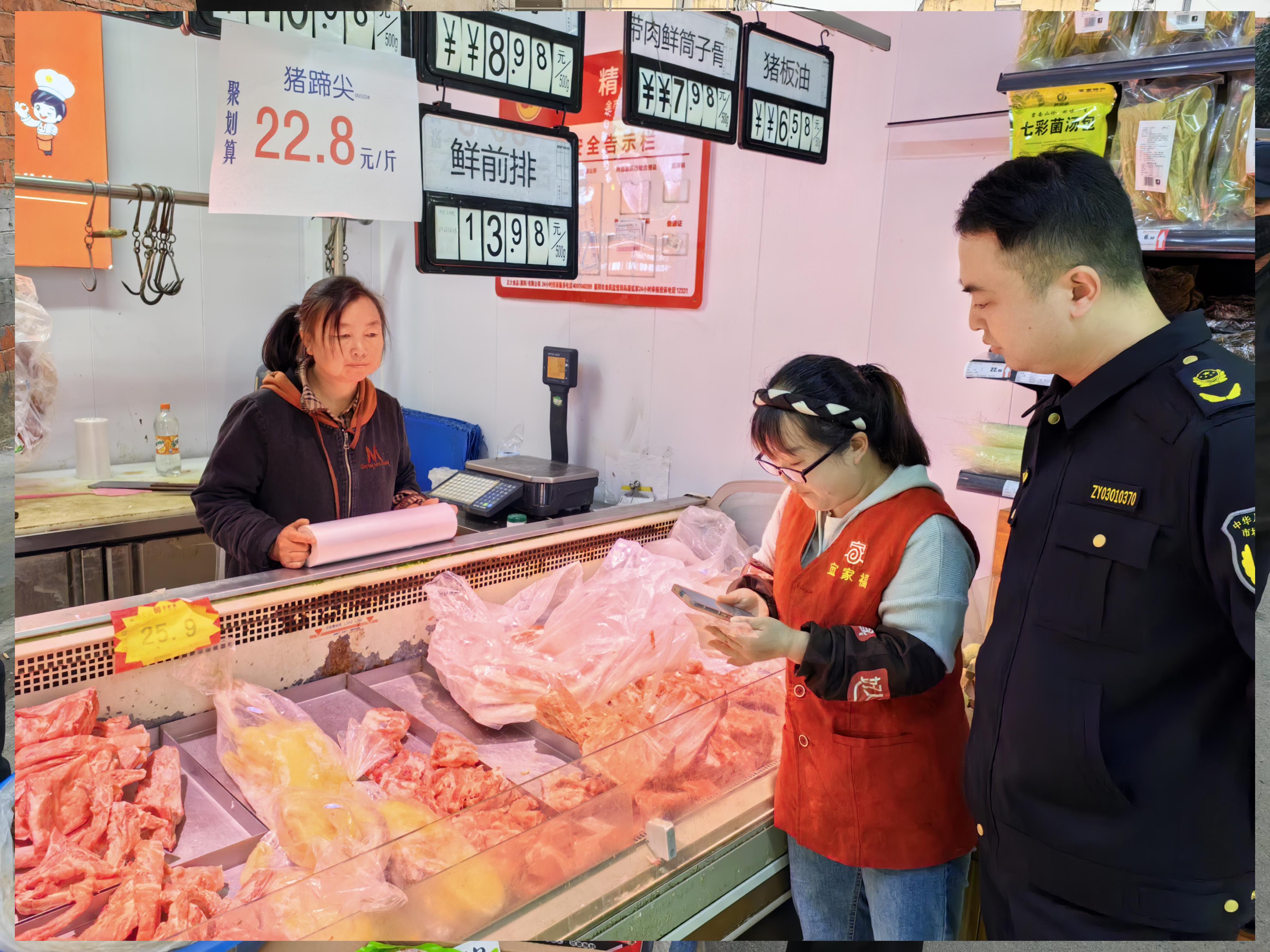 执法人员着重对食品、价格、计量等重点领域开展安全监管。年关将至,居民对肉制品的需求量高,执法人员检查其进货渠道是否正规、售卖猪肉的商贩有无检疫检验证明,确保票章一致,从源头杜绝不符合食品安全标准的肉类进入市场;检查是否有野生动物贩卖,有无长江鱼类售卖;对市场上的计量秤进行查验,着重检查是否存在使用未经检定、检定不合格、超过检定周期的电子计价秤或安装作弊装置等计量违法行为,并对计量相关法律知识进行宣传,提高商户与群众对于价格计量方面的相关认识;对市场上的价格公示制度进行检查,检查是否存在节前串通涨价、虚标原价、货签不对应的现象,切实维护消费者权益。