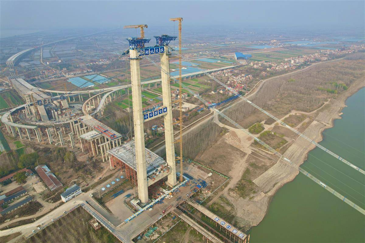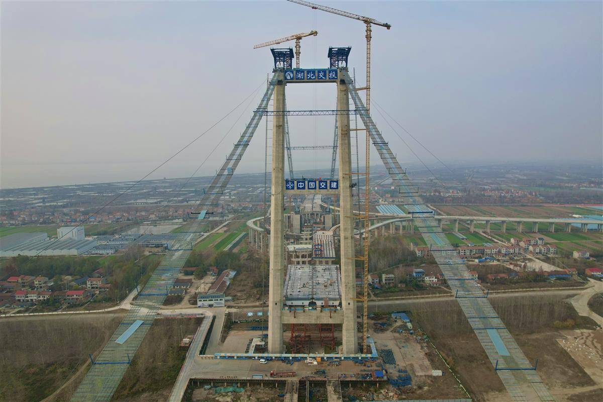 在大桥武汉新洲侧,记者乘电梯登上200多米高的主塔,平台上北风凛冽,江面船只点点。两条各4米宽、相互间隔40多米的猫道,往江心延展1700多米,一直连接到对岸的主塔上,在江面划出一道优美的弧线。一旁的中交二航局项目副总工杜磊解释,猫道是进行悬索桥主缆架设的高空施工便道,犹如“高空脚手架”。