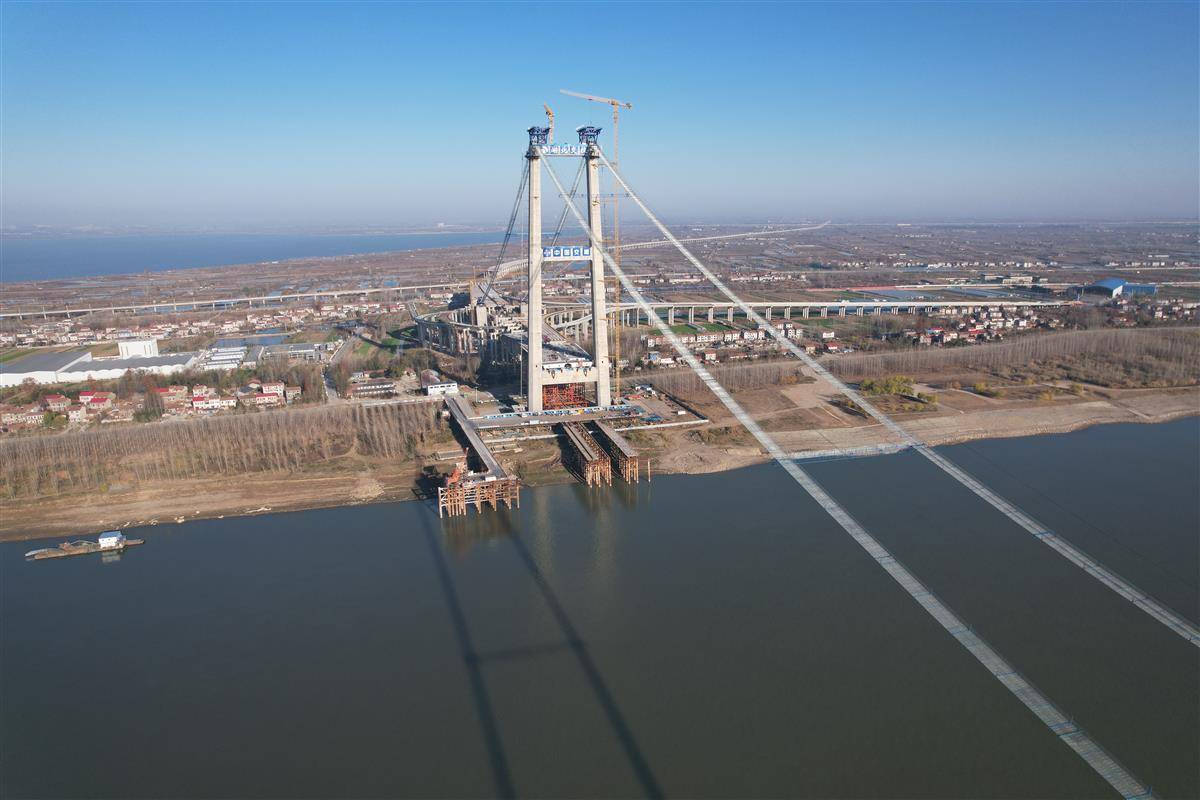 双柳长江大桥猫道建成贯通。通讯员 许豹 摄