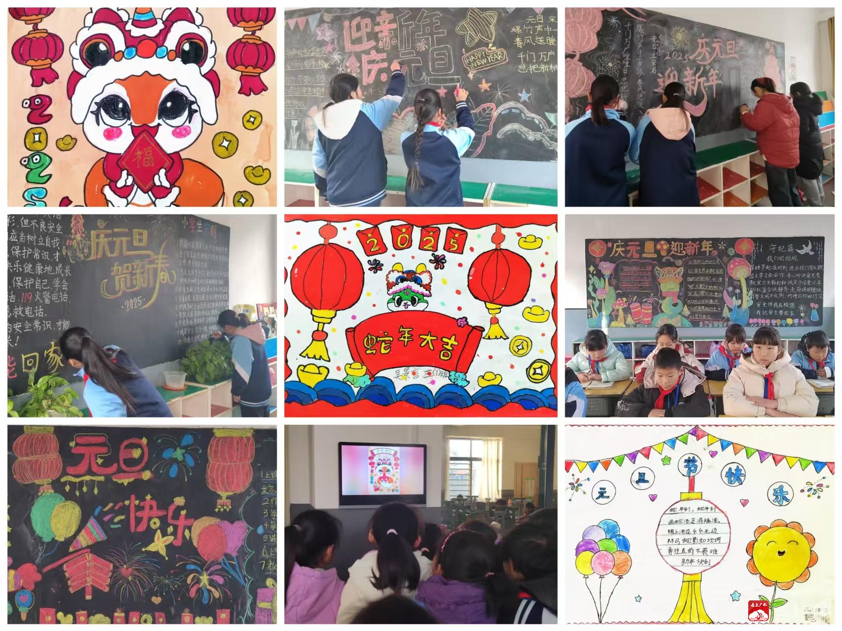 活动期间,同学们利用课余时间精心设计、绘制,用五彩斑斓的画笔描绘出对新年的美好愿景。从精美的插图到工整的文字,每一份手抄报都凝聚着孩子们的心血与智慧。各班级将优秀手抄报上传到希沃云班,在教室门口的电子班牌中展示,吸引了众多同学驻足欣赏。各班班主任带领同学们精心策划、布置黑板报。从版面设计到内容编排,每一个细节都经过深思熟虑。无论是文字还是图画,都充满了创意和心意,体现了班级的独特风格。