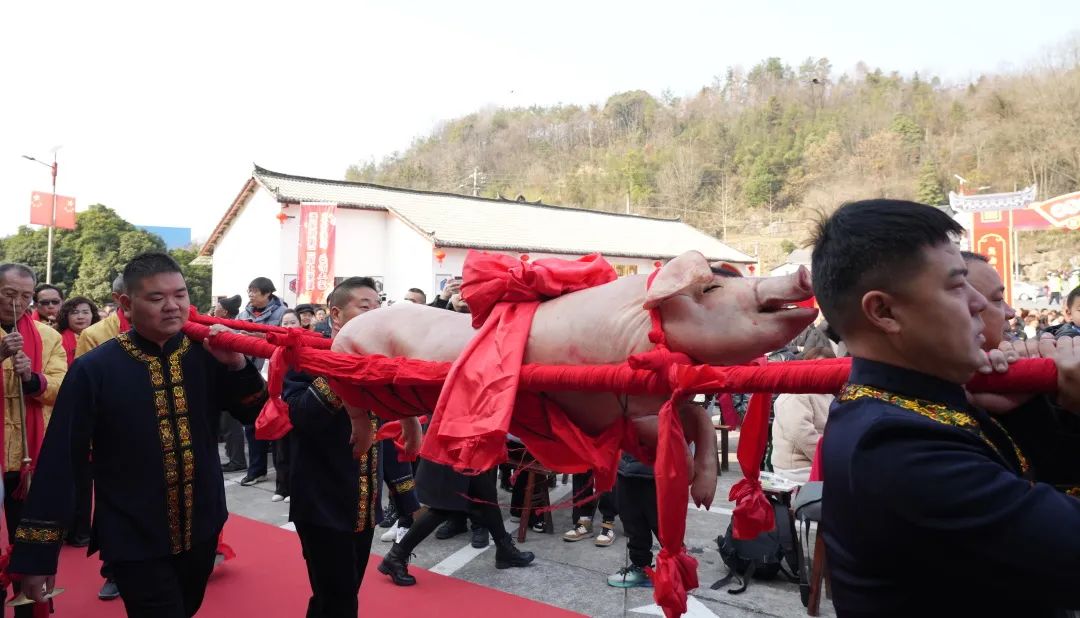 村民们抬年猪、摆酒、上香