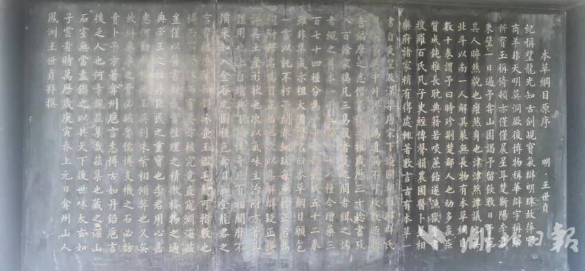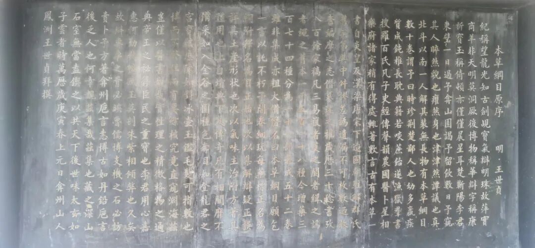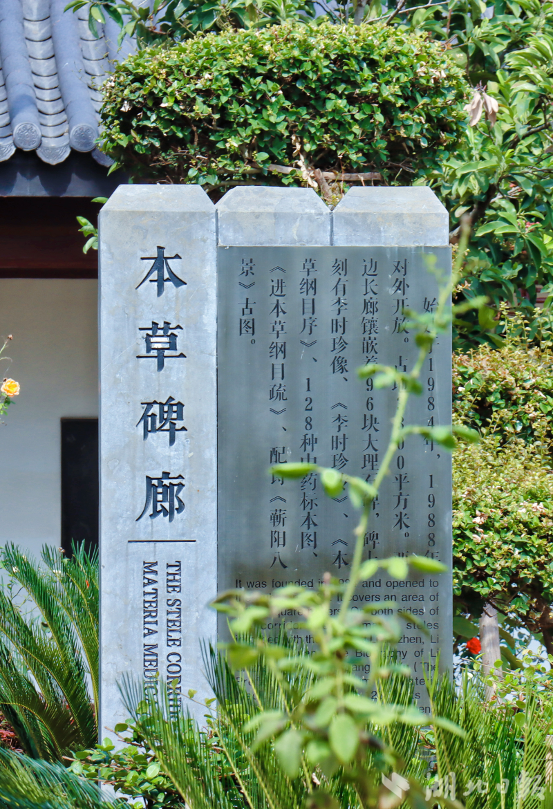 本草碑廊始建于1984年,于1988年开始对外开放,由左右两边的长廊组成,在两边的长廊上一共镶嵌着96块黑色大理石碑,分别刻有李时珍像、《李时珍传》《本草纲目序》、128种中药标本图、《进本草纲目疏》和配诗《蕲阳八景》古图等。