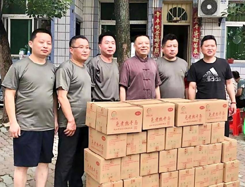 图为余洪江(右3)为孝心村200多名老人捐赠热干面等食品。