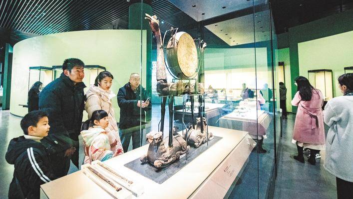 在南馆展出的镇馆之宝曾侯乙编钟、越王勾践剑、曾侯乙尊盘、虎座鸟架鼓、彩绘人物车马出行图人气大旺,郧县人头骨化石、石家河玉人像、崇阳铜鼓、云梦睡虎地秦简、元青花四爱图梅瓶,这些因北馆升级布展而短暂告别观众的镇馆之宝全面回归。