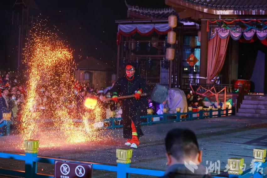 在均州码头,伴随着激情的音乐,一场大型火秀表演震撼上演。火壶、火刀、火棍及喷火秀等精彩节目轮番上演,表演者们的精湛技艺和惊险表演引得现场观众阵阵惊呼。火秀表演不仅展现了中华传统技艺的魅力,也为跨年夜增添了一份别样的热情与活力,让整个景区更加热闹非凡。