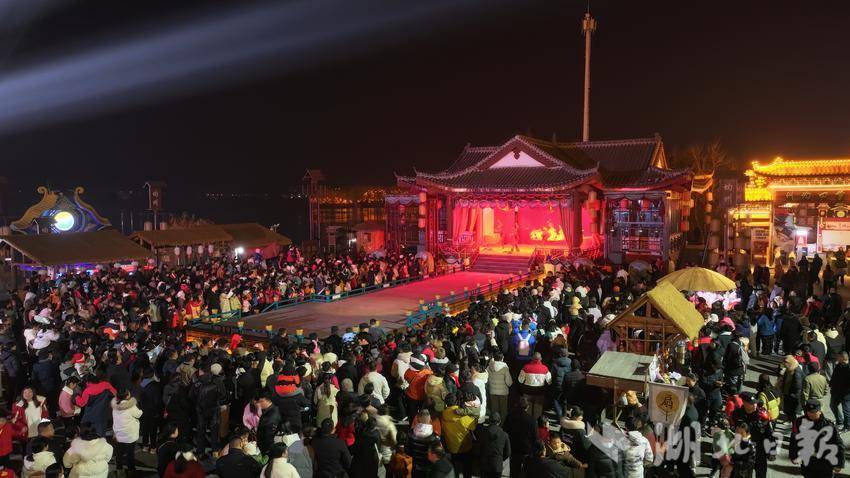 与此同时,水都花月夜景区也披上了节日的盛装,变成了一片璀璨的星海。五彩斑斓的灯光将整个景区装点得如梦似幻,各种灯光交织在一起,形成了一幅幅美丽的画面,令人目不暇接。步行街上,古色古香的仿古建筑与琳琅满目的特色美食相映成趣,游客们漫步其中,品尝着各式各样的美食,感受着浓厚的节日氛围。