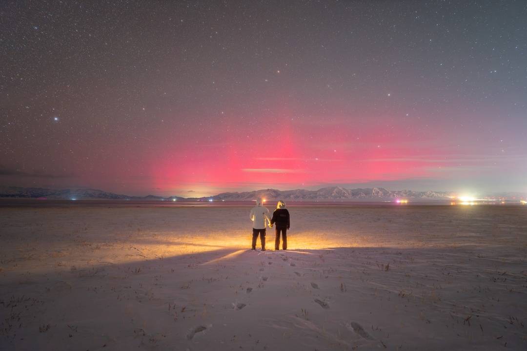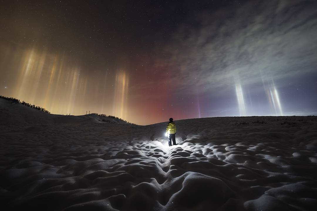 星联CSVA星空摄影师孙佳新,2025年1月1日夜摄于新疆阿勒泰禾木村,极光与寒夜灯柱现象同时闪现在夜空。