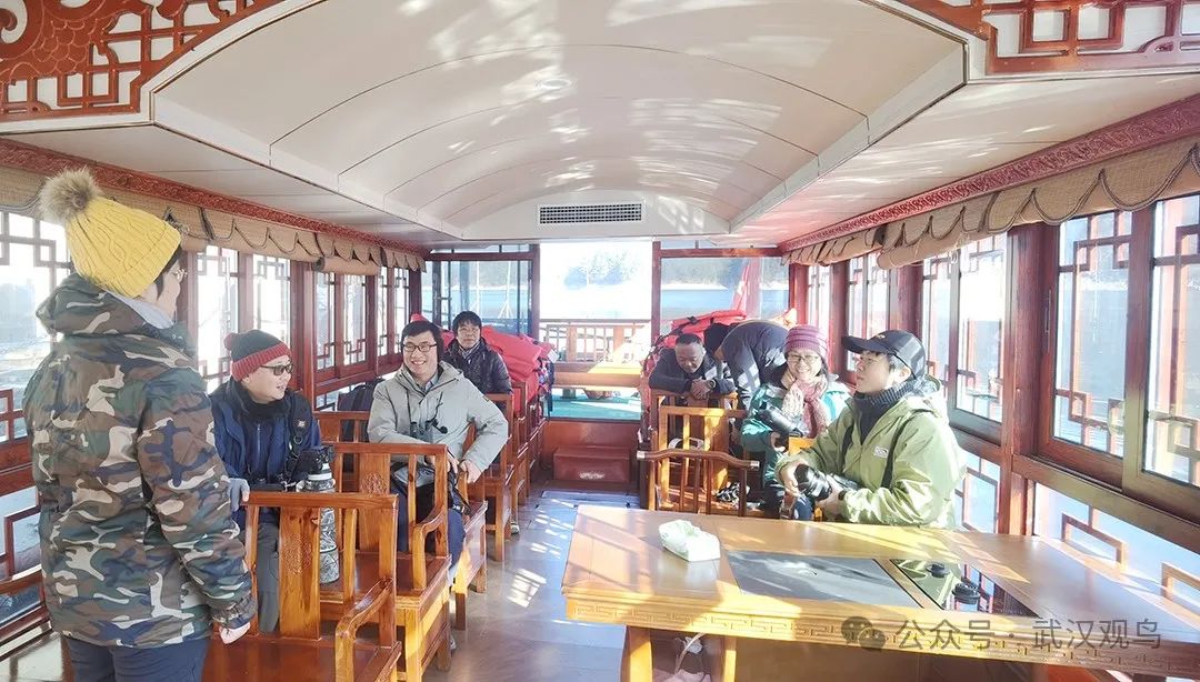 由于冬天湖面体感比较寒冷,所以海芳老师安排下午乘游船观秋沙鸭,没想到安排的游船是一艘精美的木质雕花游船,湖中行船非常平稳。