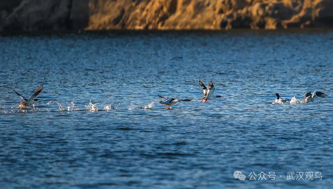 写了这么多还说回正题——观鸟,其实还没到天堂湖,沿路就看到了好几只黑鸢在天空盘旋,可想而知这次的“开光之行”肯定收获满满,天堂湖湿地公园管理处的余主任亲自开船,带着一船人在湖中边赏景边观鸟,我们最先看到的是在岸边晒羽毛的普通鸬鹚,估计它们已经吃饱喝足(和我们一样),晒着太阳,安逸地等着太阳落山,余主任很热心的开船在各个小湖汊寻觅中华秋沙鸭的身影,在一处避光的湖边看到了一群鸳鸯,这可是我的新呀!这么美丽的生灵,从来只在别人的图片里见过,可惜的是它们生性谨慎,一发现我们就呼啦啦地飞走了,好在回到大湖时,在湖面发现了几只中秋,和鸳鸯一样的远远地就都跑了,还是大师们厉害,飞起的瞬间抓拍到了,图中可以清晰地看到中秋特有的中队长标志。下午行程的高光时刻在下午四点,游船开到湖中小岛附近,几十只黑鸢悉数落在岛上的大树上,瞬间有了一种“枯藤老树黑鸢,小岛湖水人家”的苍凉感(哎呀~扯远了),在湖边山上盘旋的黑鸢,与小岛上的黑鸢汇合一起在我们的船顶盘旋,形成了壮观的鸢柱(不要嫌弃我没见过世面的样子),我也抓住这个大好机会,拍到了一张黑鸢特写,算是圆满地完成了此次的开光目标。
