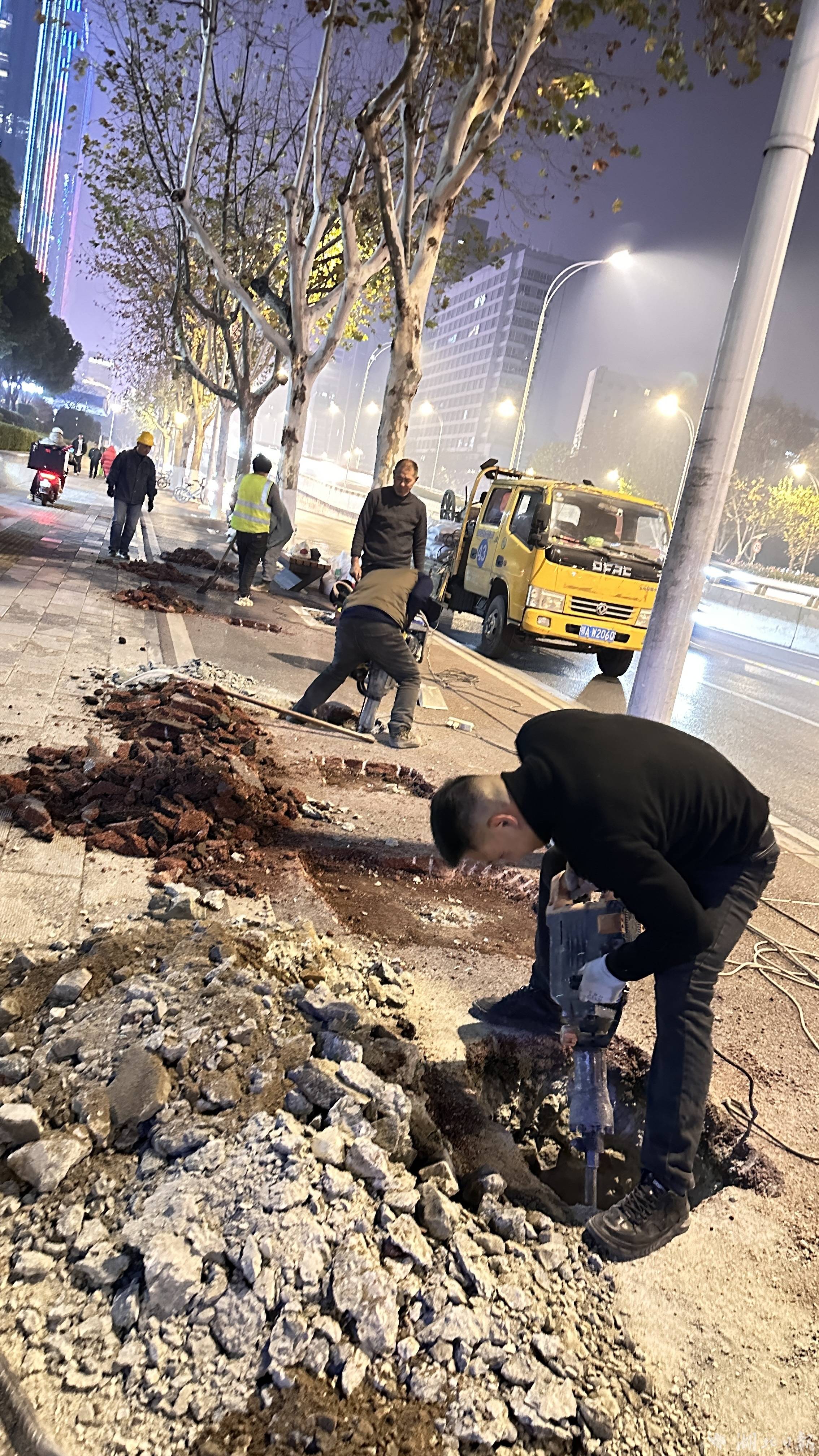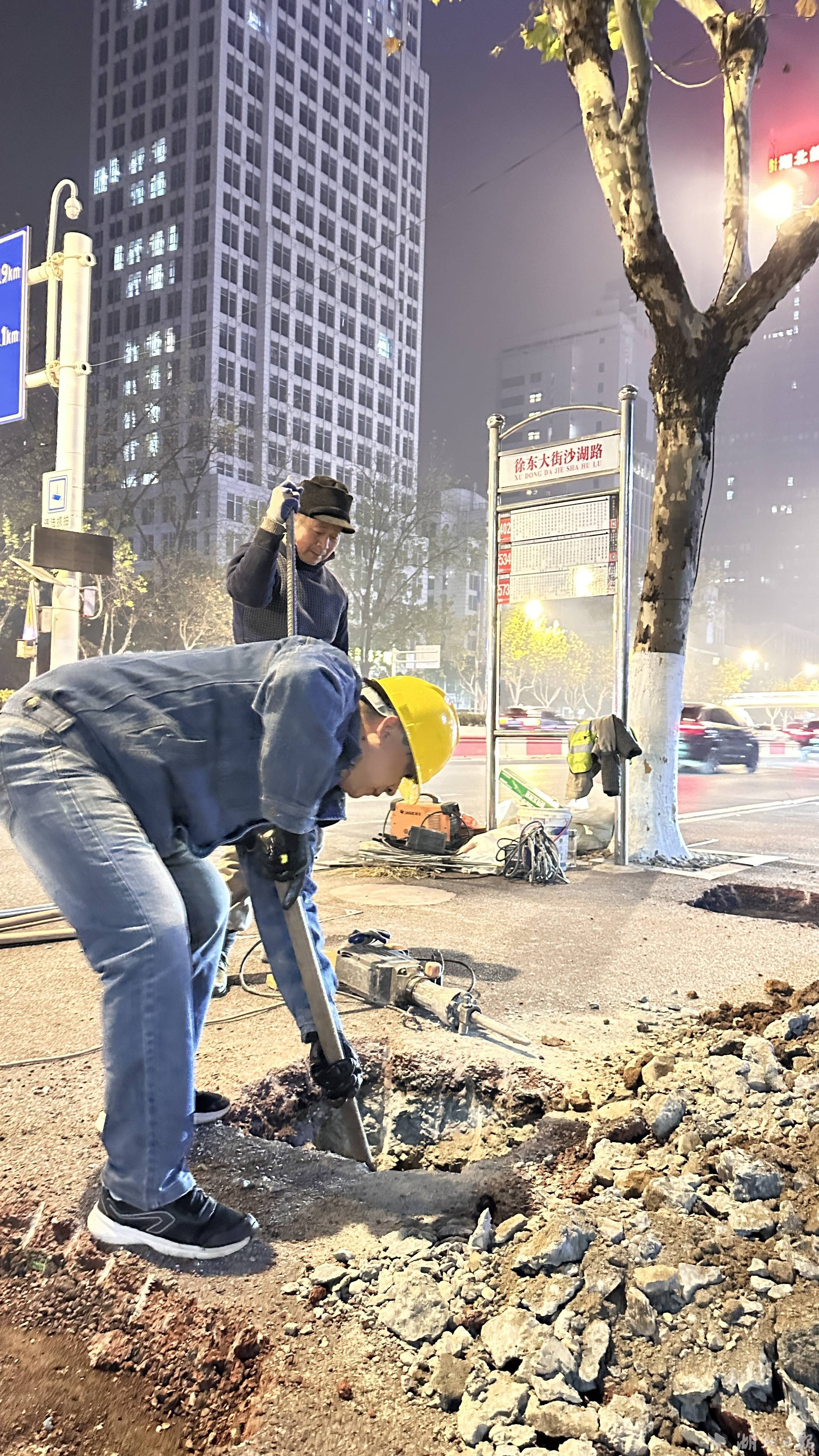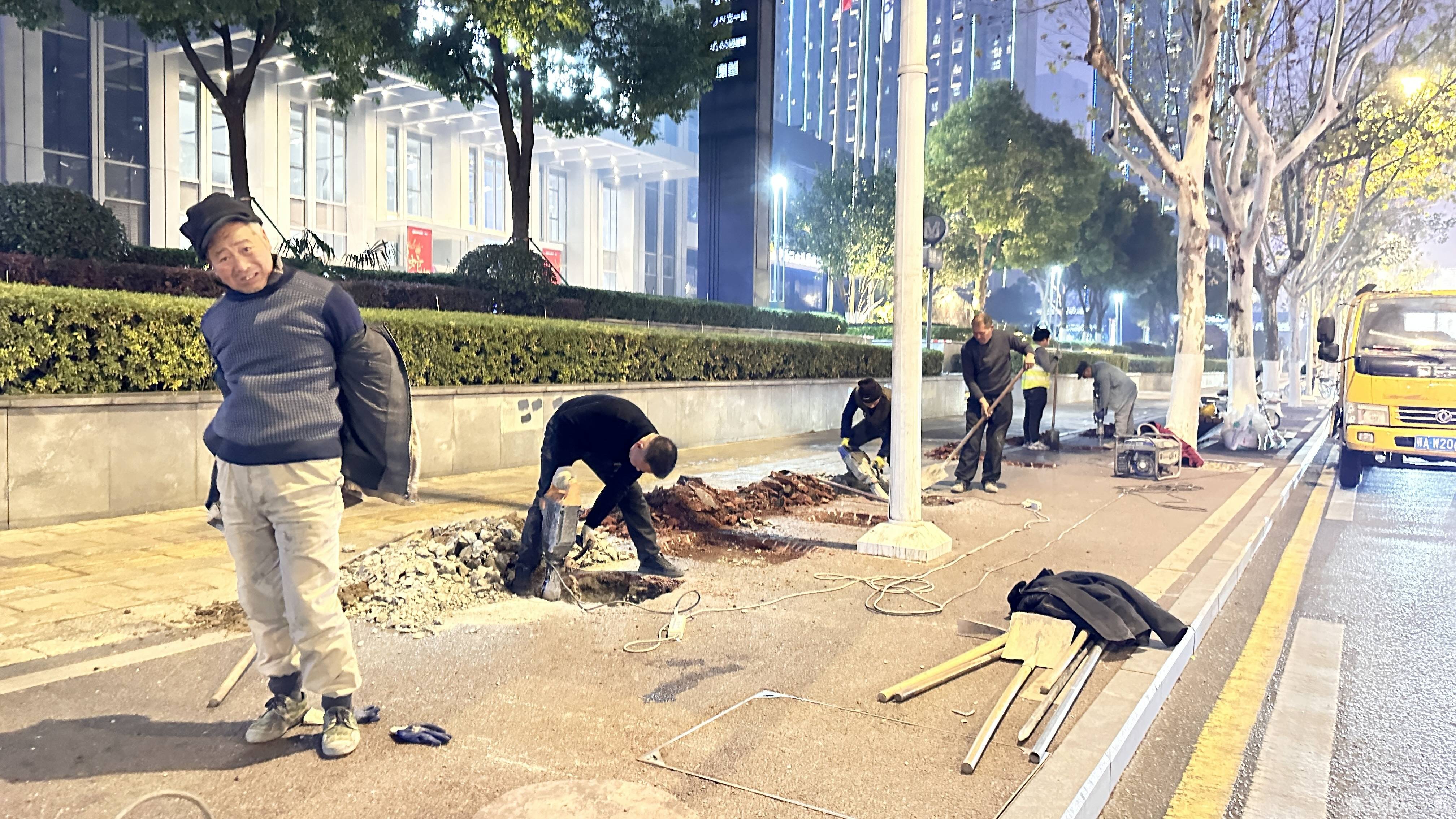 1月3日晚9时许,临时站台处,8名工人干得热火朝天,现场负责人余工用专业设备开凿基坑。他说,迁移的智能站台需要8个基座来稳固站棚,每个基座的基坑长宽高约80厘米,基坑底部用钢筋做骨架,浇灌混凝土后,进行振捣密实并找平,以确保基座坚实、平整、可靠。
