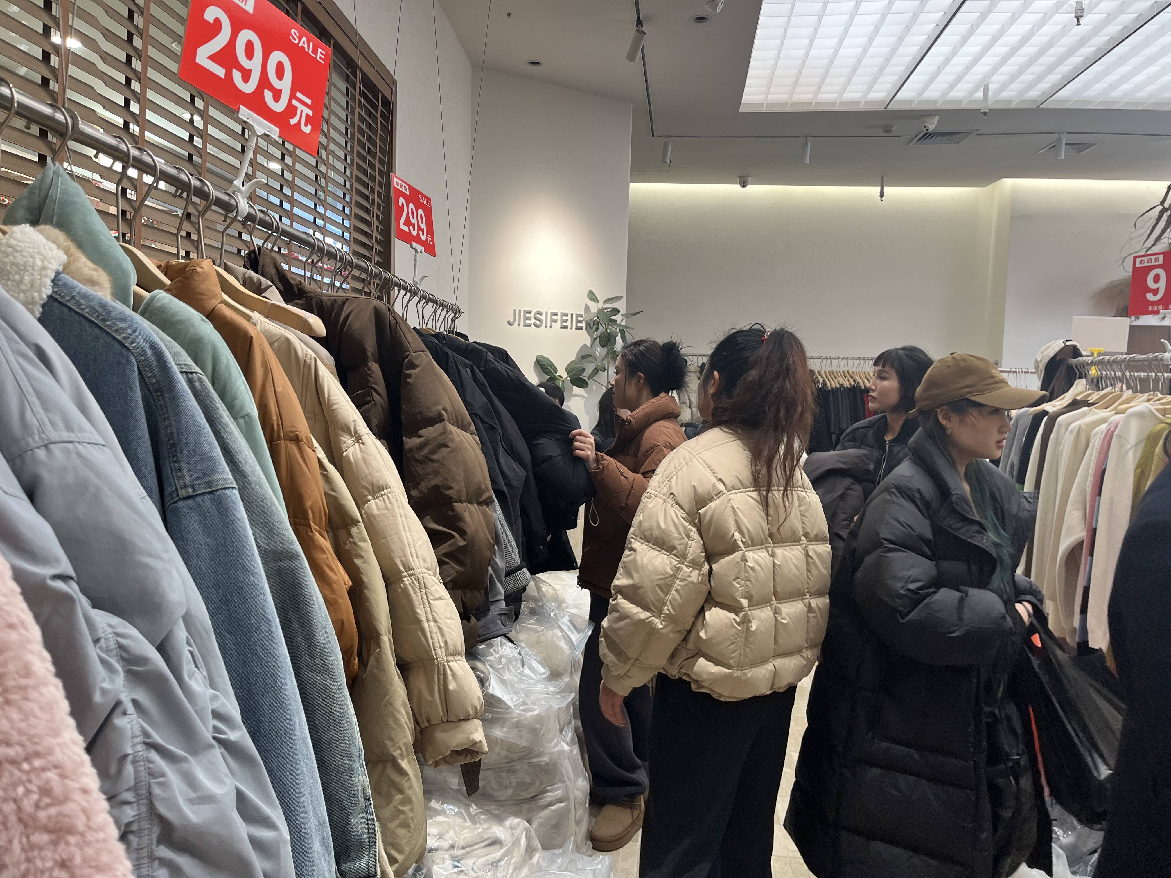“‘新年战袍’从现在开始基本进入旺季,一天最高能卖500件,羽绒大衣的销量尤其好,有些款式都断码了。”YS女装店铺销售人员介绍。