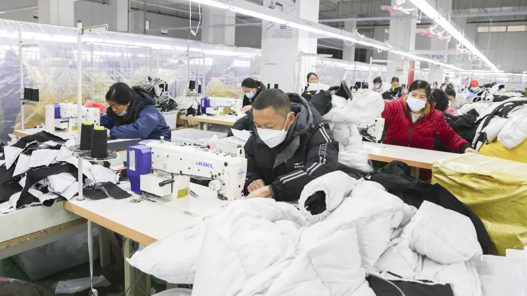 2024年12月19日,江苏省沭阳县工业园区一制衣厂内,工人正在加足马力赶制羽绒服订单。陆华 摄