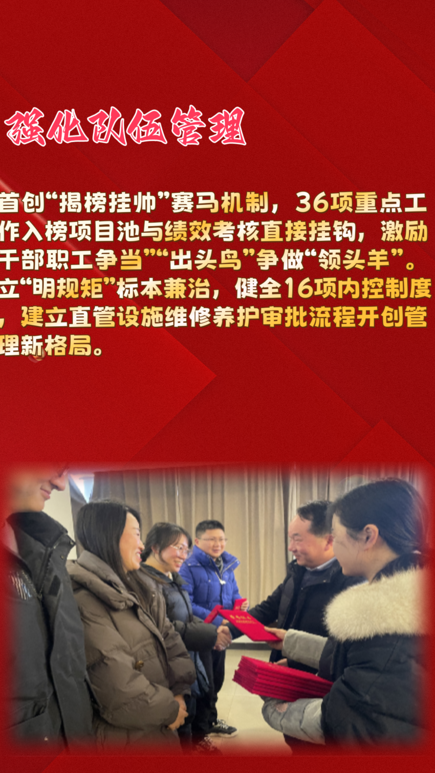 会上,各科室一展风采,对全年工作完成情况、存在问题及下一步打算进行了汇报,晒成绩、找不足、谱新篇。顾继胜总结了过去一年处支部在赋能单位发展、树立业务品牌等方面取得的成效,并从提升市政设施维护品质、提升城市安全运行能力、赋能智慧化治理水平、加强人才工匠培育四个方面展望了新一年工作规划,鼓励干部职工奋发进取、担当作为,围绕“世界级、典范城”奋斗目标,持续推进城市建设运营治理一体化新模式和城市安全运行新模式,不断提升市政设施维护管养品质,为实现城市更宜居、韧性、智慧贡献力量。