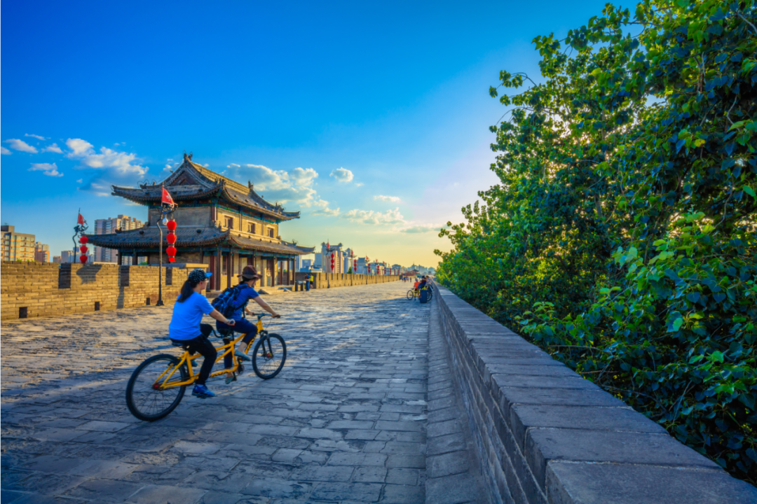 游客在陕西西安城墙上骑行。人民日报记者 张丹华 摄