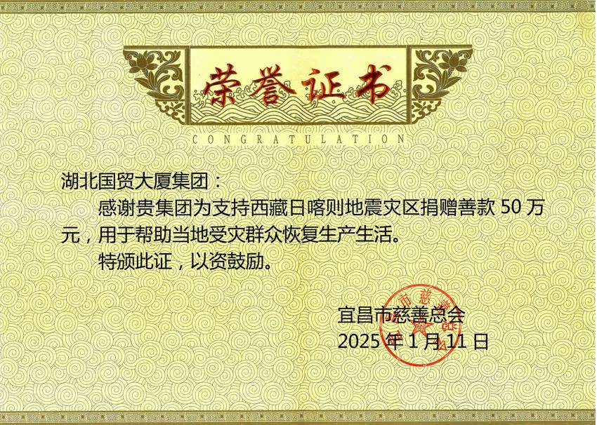 湖北国贸集团始终牢固树立社会责任大于经济效益理念,始终坚守社会责任,热心慈善公益事业,不断加大投入,广泛开展各类慈善公益活动,从雅安地震到日喀则地震,从抗疫保供到长江大保护,从新农村建设到乡村振兴,从留守儿童到困境学子,凡是有需要帮助的地方,国贸集团都慷慨解囊,及时援手,多年来,国贸集团累计捐款捐物总价值过亿元,先后荣获宜昌最具慈善爱心捐赠企业、宜昌关心儿童成长爱心单位、宜昌市望工程突出贡献企业、宜昌爱心企业等数十项殊荣。