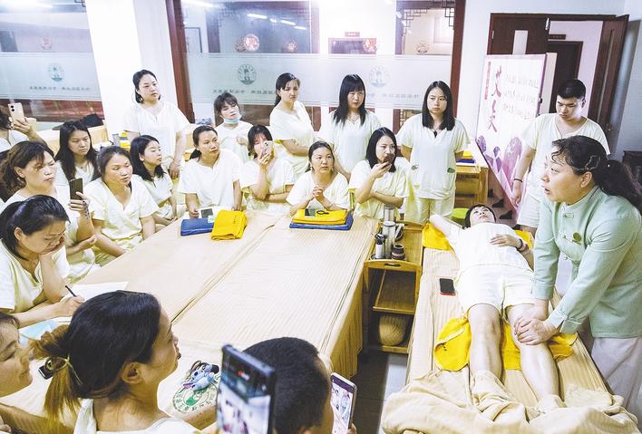 蕲春县李时珍医药集团给来自全国各地的百余名学员做艾灸疗法培训。近年来,蕲春县已培训艾灸师7.3万余人,带动全产业链就业创业30余万人。 (湖北日报全媒记者 薛婷 通讯员 陈钰 摄)