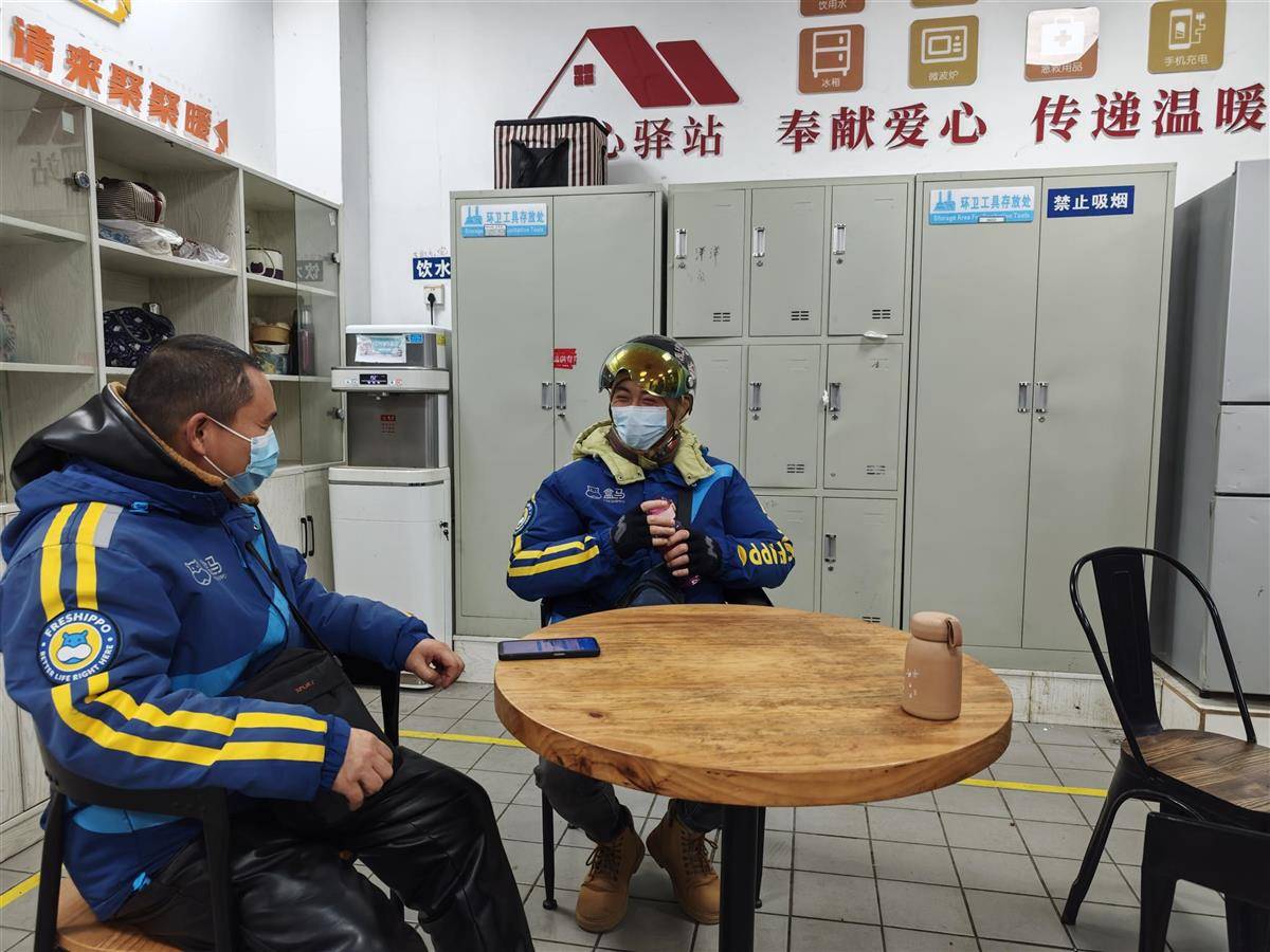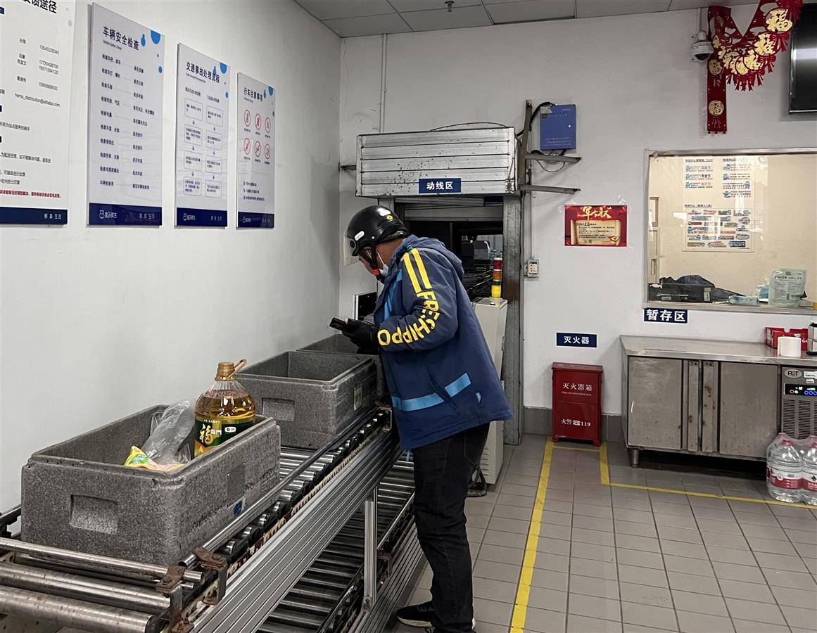 湖北日报讯(记者童晨曦、通讯员胡晓蓓、王建)屋外寒风凛冽,室内温暖如春。1月13日下午5点左右,武汉市汉阳区盒马鲜生龙阳大道店迎来了线上订单的高峰期。一袋袋包裹通过自动传送带从商场内部迅速传送到“阳小驿”户外工作者服务驿站,由配送员们依次认领。“在驿站里等待商品打包时,我可以泡杯茶,边休息边给手机充电,非常舒服。再也不用在寒风中等待,手也不会冻僵了。”配送员小汪竖起大拇指说道。