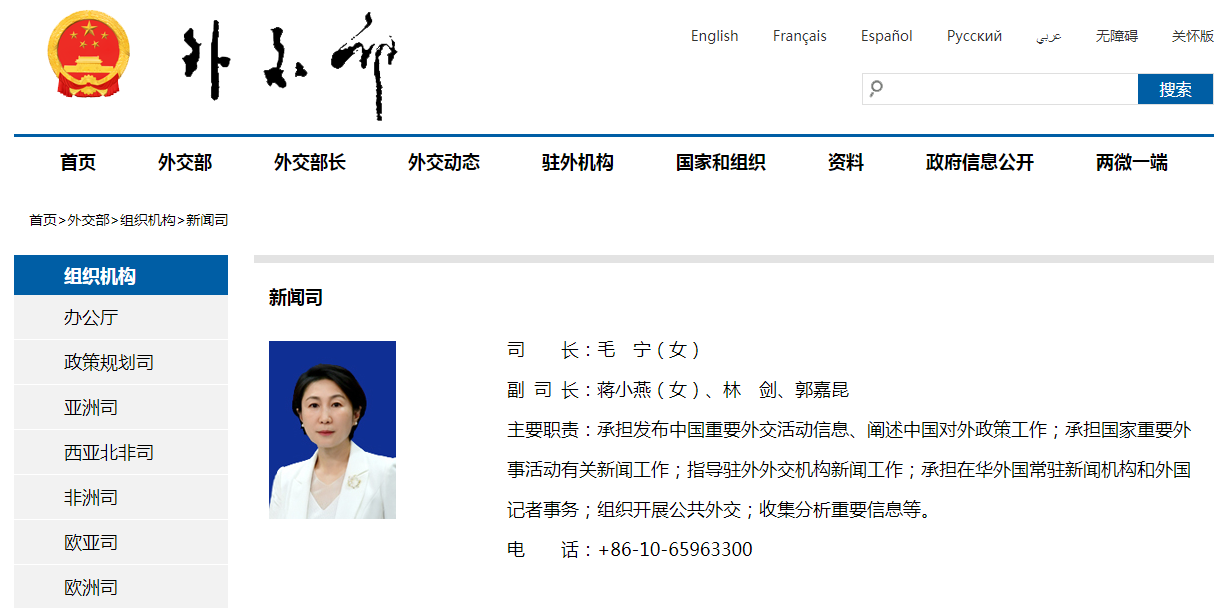 外交部网站“新闻司”一栏最新信息显示,毛宁已任外交部新闻司司长。