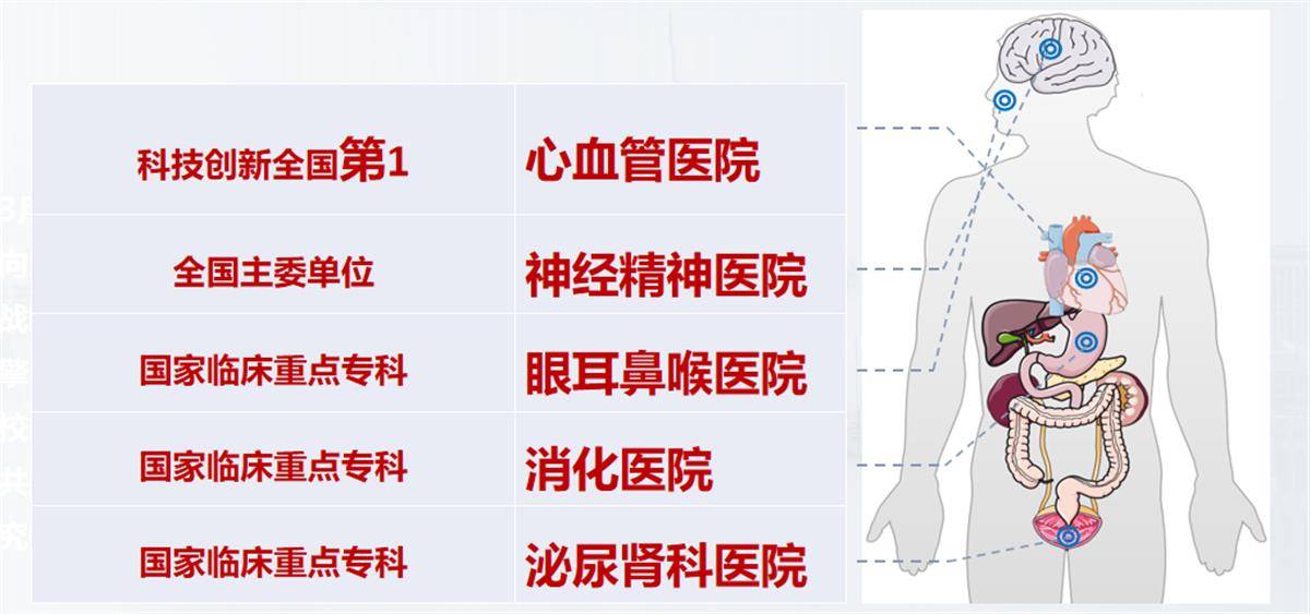同时,与武汉大学世界顶尖学科的7位院士、70余位国家级人才合作,共建7个跨学科融合医学研究中心,包括全球首个医学遥感信息研究院、全国医院首个医工融合研究院、公共卫生研究院、分子医学研究院、医学人工智能研究院、医学与物理研究院、先进医学研究院等。每年投入1500万元经费支持107项交叉创新研究,共同推进“医学+”多学科交叉创新体系建设,培养了一批具有国际视野、前瞻思维、学科交叉创新意识的创新团队和创新人才。 对标医学发展前沿和国际一流医院发展趋势,该院遵循“以系统为中心”和临床诊疗“微创化、精准化、舒适化”等医疗发展理念,创新成立心血管医院、神经精神医院、眼耳鼻喉医院、消化医院、泌尿肾科医院等“院中院”,在为患者提供更加高效、精准、便捷的“一站式”集成健康医疗服务的同时,更将院中院作为“学科交叉融合+科技创新”的平台。 为培养高水平优秀人才,从2018年起医院陆续派出100多名优秀青年人才赴国外著名医学院访问、学习和进修。近五年来,医院国家高层次人才总量增加了近3倍,数量位于武汉大学医学口前列,新增“国字号”人才居全省医疗行业第一。