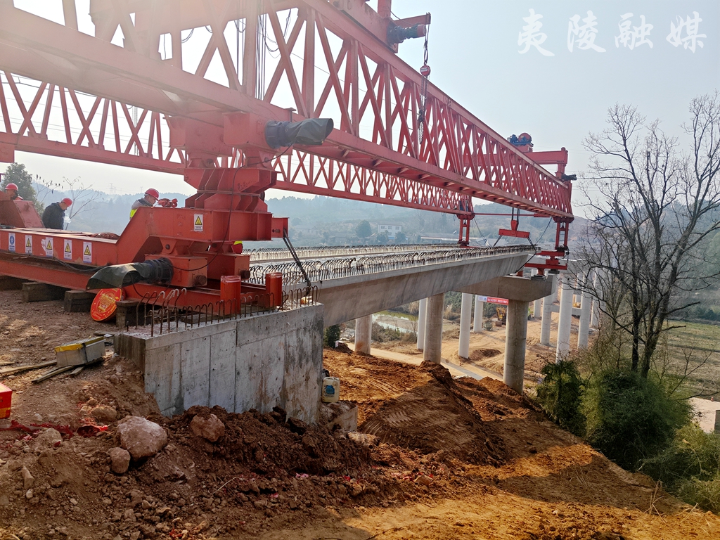 为了保障该桥能够高效、安全地完成吊装施工,最终施工方选择采用多用于铁路、高速公路等高等级大跨径桥梁中使用的架梁机进行梁板吊装作业,这也是夷陵区桥梁建设中首次应用架桥机进行梁板吊装施工,“这样能够高效优质地保证架梁的质量,确保安全。”G348夷陵区鸦鹊岭至土门段公路工程项目负责人孙浩介绍道。