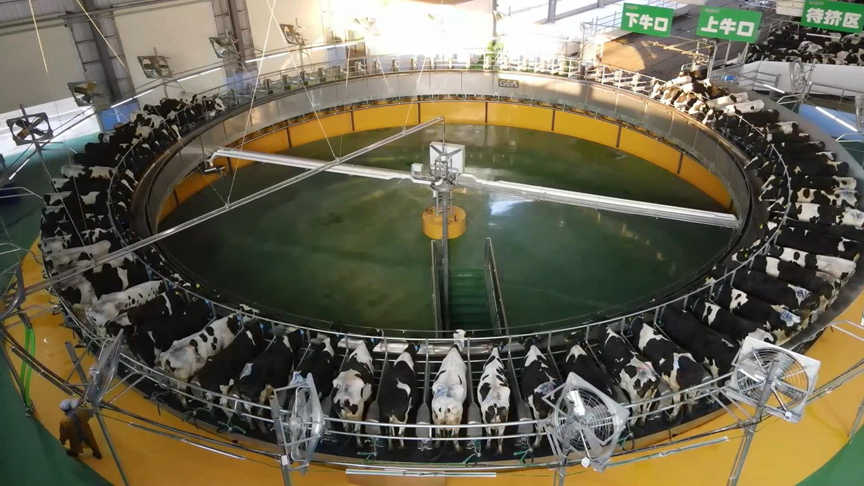 我现在在云上牧歌(襄阳)万头奶牛智慧产业园,我身后是一台可以容纳80头奶牛同时挤奶的转盘式挤奶机,现在每天有1300多头奶牛在这里挤奶,一天鲜奶的产出量大概是33吨,随着小牛出生,泌乳牛数量的增加,鲜奶产量也随之攀升。