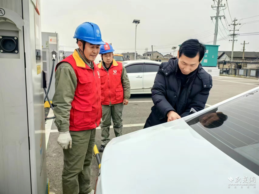 在枝城镇城坡垴电动汽车快速充电站,共产党员服务队队员仔细检查充电桩及其配套设备运行情况,查看充电桩指示灯颜色、充电线绝缘层是否磨损,对充电桩的运行情况、保护装置、充电枪等进行全方位“体检”,及时消除充电桩设备运行隐患,保证充电桩的正常使用和充电效率。