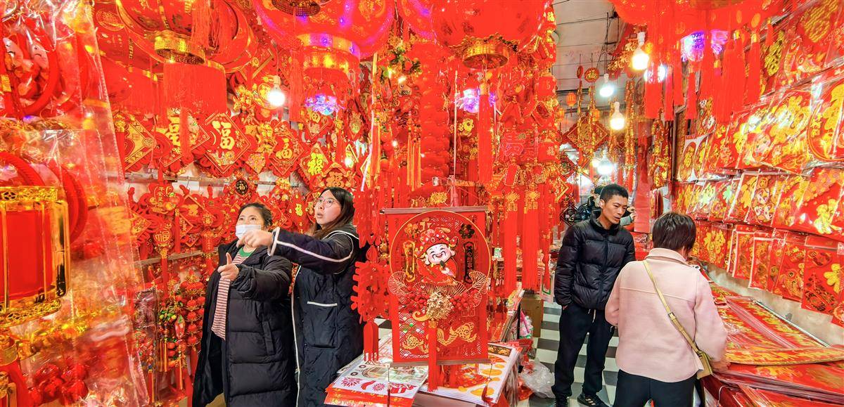 1月21日,在武汉汉正街的年货市场,许多市民在商铺内选灯笼、购饰品、买春联,大包小包地采购各种年货商品。年关将近,武汉人打年货进入了高潮,汉正街迎来生意旺季。