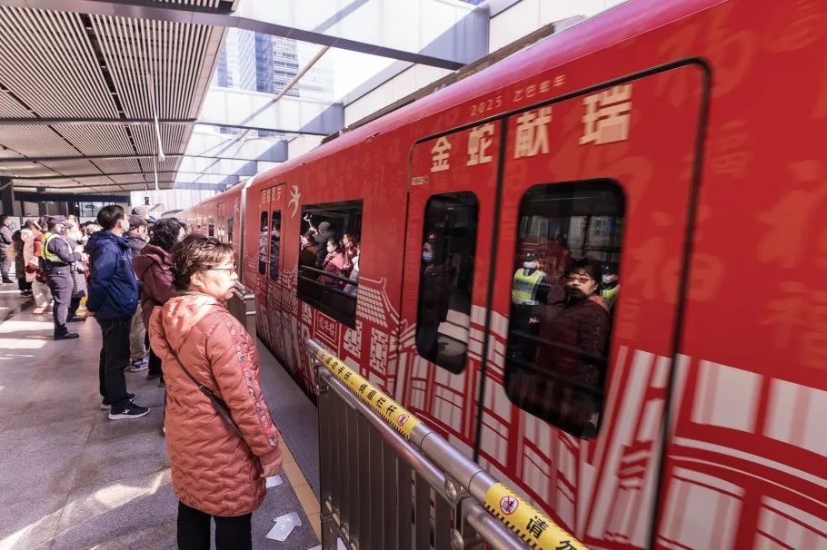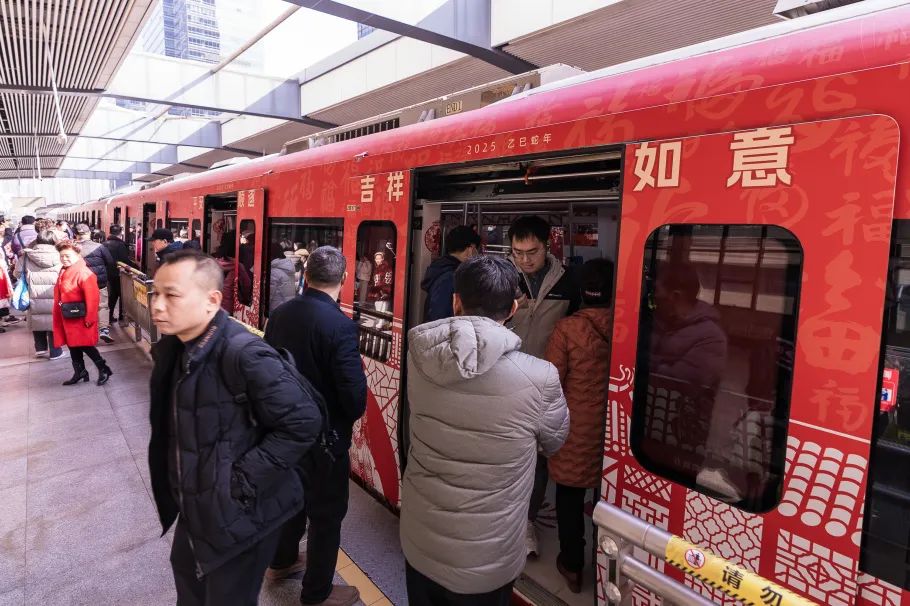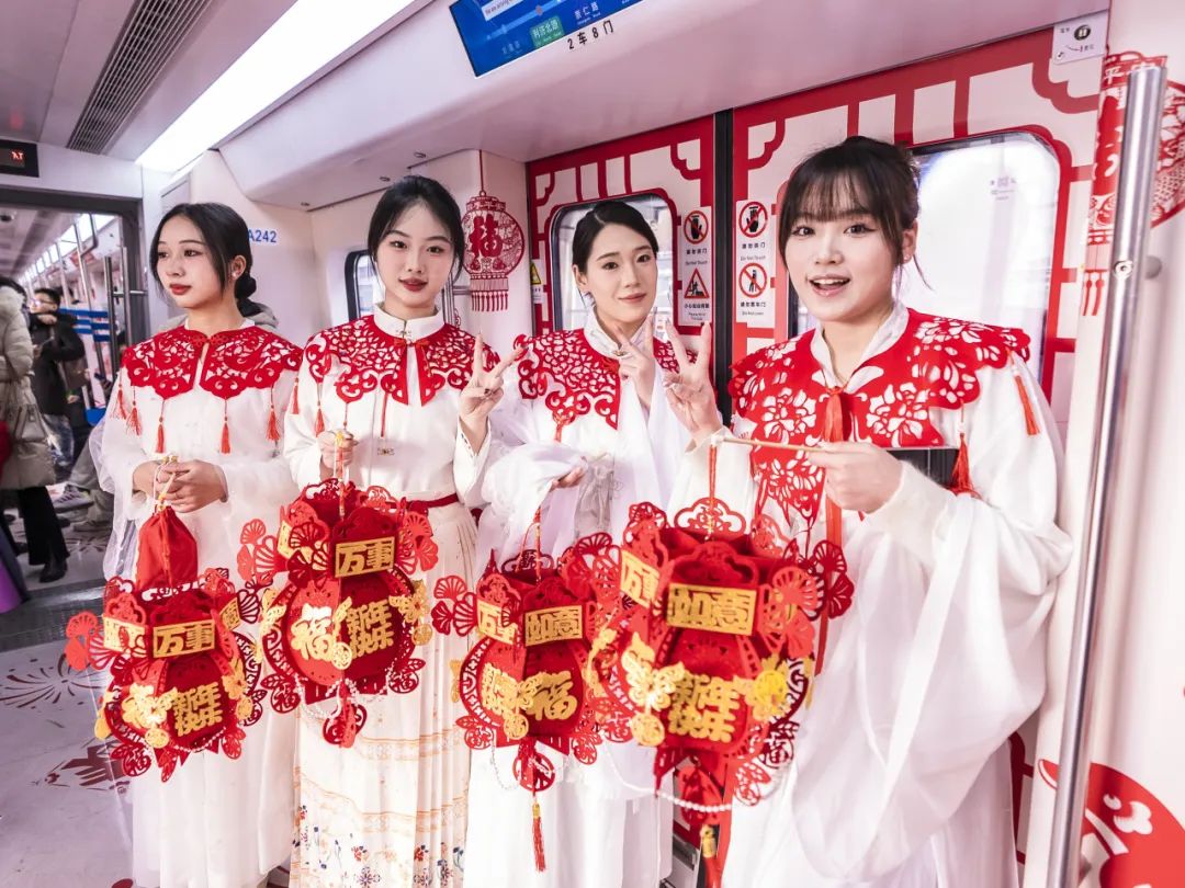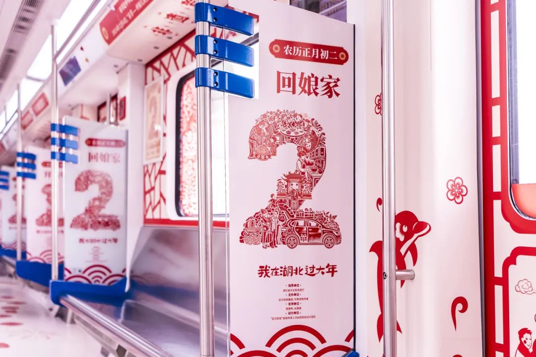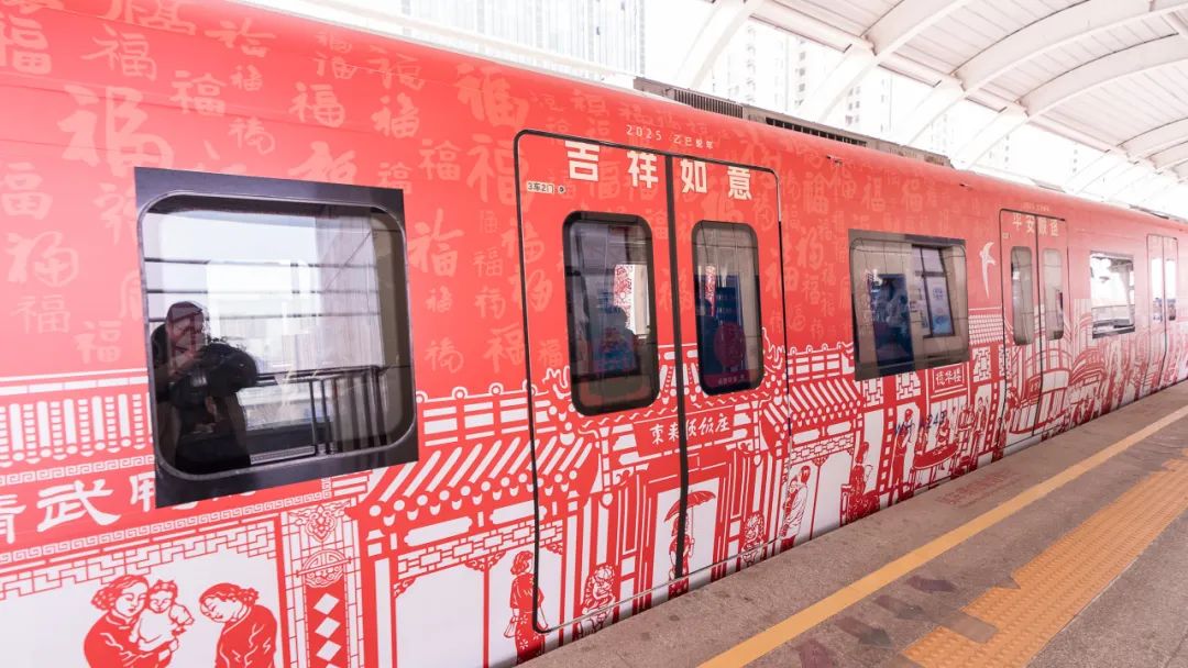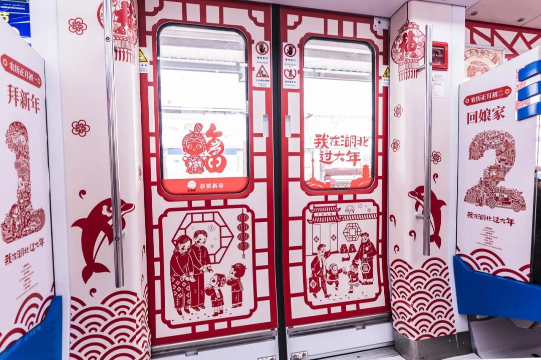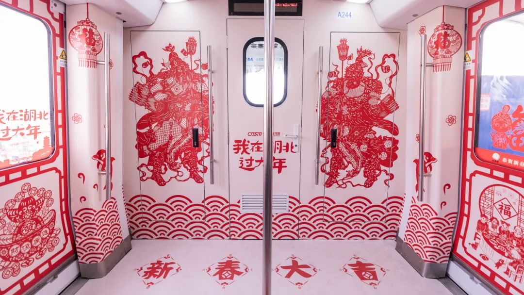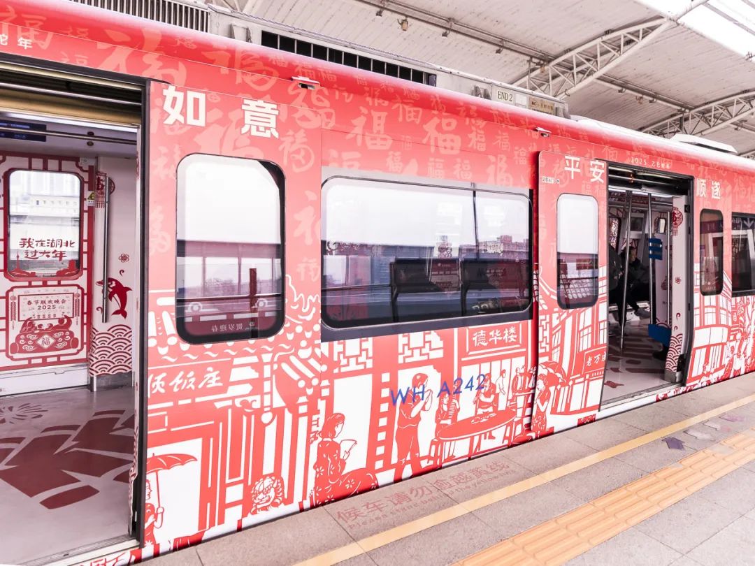 这辆“非遗贺新春”地铁专列以城市地标长卷为外包车衣、以春节年俗为车内设计,外观采用了"武汉剪纸"省级传承人沈松柏老师创作的经典长卷作品,完美呈现了武汉地标性建筑与传统剪纸艺术的精彩融合。