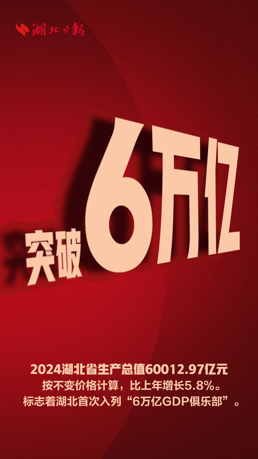 根据地区生产总值统一核算结果,全年全省实现生产总值60012.97亿元,按不变价格计算,比上年增长5.8%。分产业看,第一产业增加值5462.18亿元,增长3.1%;第二产业增加值21573.76亿元,增长6.4%;第三产业增加值32977.03亿元,增长5.9%。标志着湖北首次入列“6万亿GDP俱乐部”。