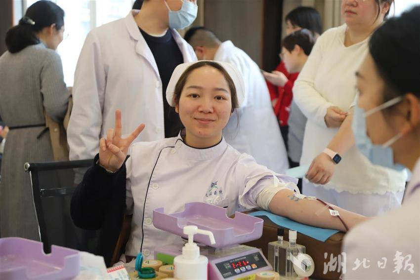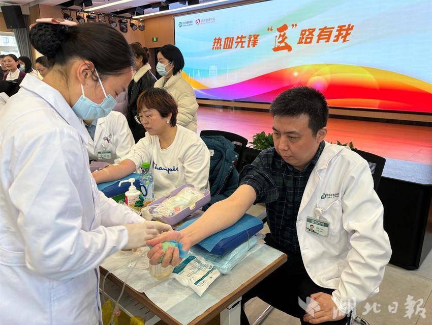 湖北日报讯(记者胡雯洁、通讯员杨京、洪芷瑄、肖莉娇)1月21日,武汉市第四医院,“热血先锋‘医’路有我”无偿献血活动举行。近百位医护人员奉献一臂之力,捐献了15800毫升的血液。