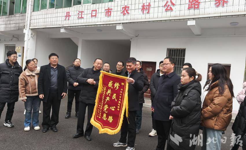 湖北日报客户端讯(通讯员 陈松松 袁慧)1月23日,丹江口市新港经济开发管理处人大工作委员会主任杨飞携同新港社区长寿山庄王彦三等10位村民代表,来到丹江口市交通运输局,将一面写着“修民心路 感共产党恩”的锦旗送到工作人员手中,以此表达对该局和农村公路养护中心对长寿山庄道路完成修缮工作的诚挚谢意。