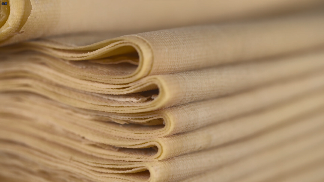 黄记千张的工艺更是细致,将布放置磨具底部摊平,将豆浆均匀舀进模具里,摊匀一层,再将纱布反过来盖一层,摊第二层豆浆,如此反复。再将几十斤的石头用扁担两头各挑一个,压榨磨具顶上,等待五六个小时,等水分榨出,千张也就制作成型了,这样制作的千张如纸一般薄,吃起来香嫩可口的,每张千张的厚度误差不超过1毫米,品尝美食的同时不得不为这种匠人精神点赞。