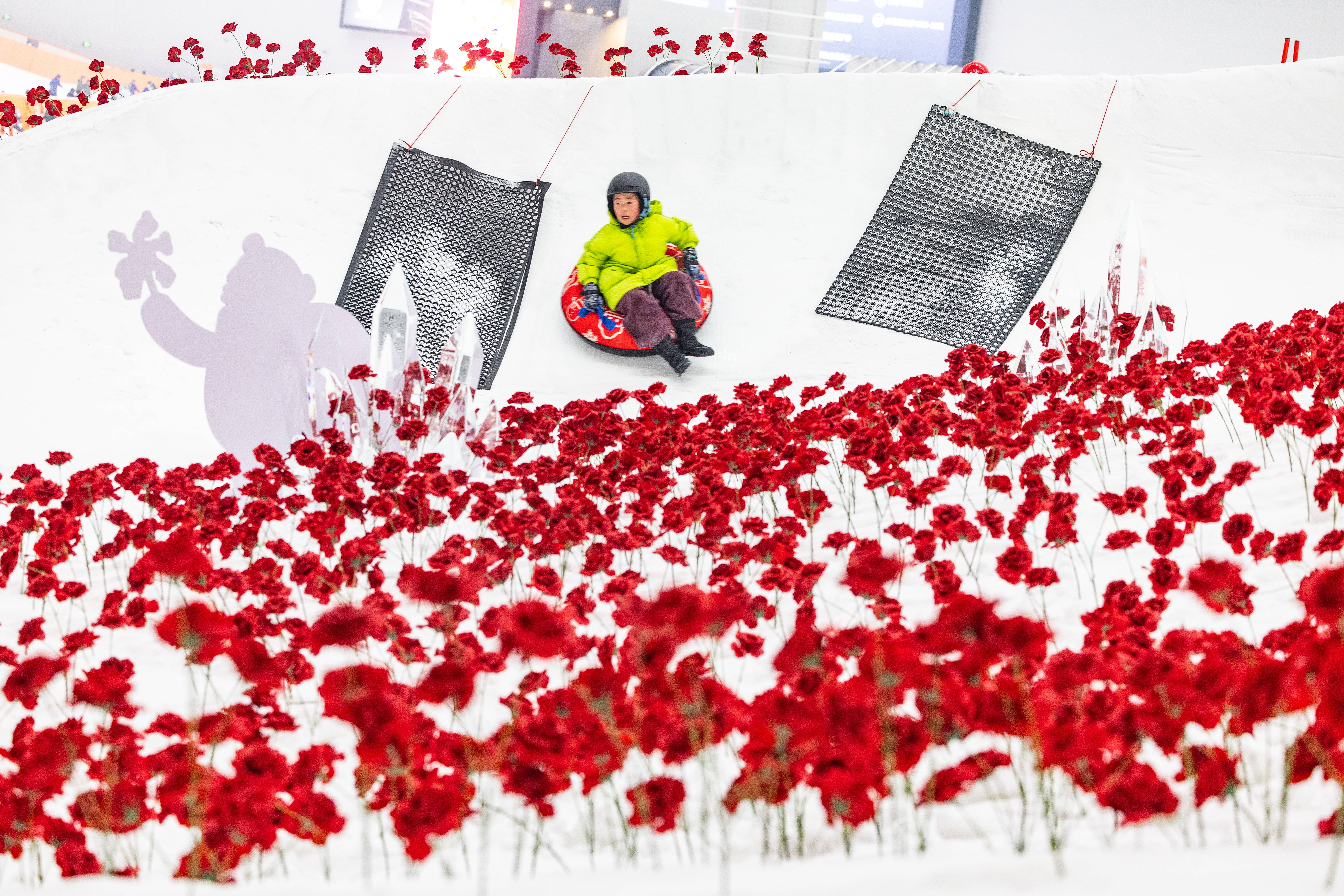 2025年1月26日,武汉市黄陂区甘露山国际滑雪场热闹非凡,娱雪区内百米的雪圈道铺满了红色的玫瑰花,游客们从高处滑下,在白茫茫的雪道上从满坡红彤彤的花丛中经过,既惊险刺激又感受到浓厚的新年氛围。