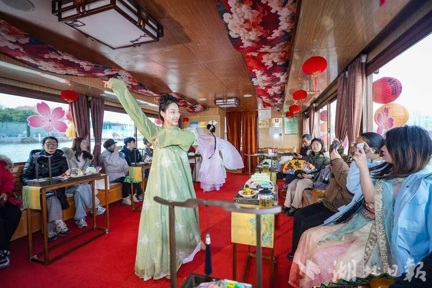 据介绍,全新上线的精品环湖游包含沉浸式国风演艺体验,游客登船之际,好戏便鸣锣开场。画舫离岸,《元夕》《一面惊鸿》《锦瑟》等国风舞蹈亮相甲板,表演者们霓裳蹁跹,或婉约柔美,或英气飒爽,在游客面前随着悠扬楚乐,将楚舞的神韵演绎得丝丝入扣,演艺中不时与游客随机互动,同贺新春。