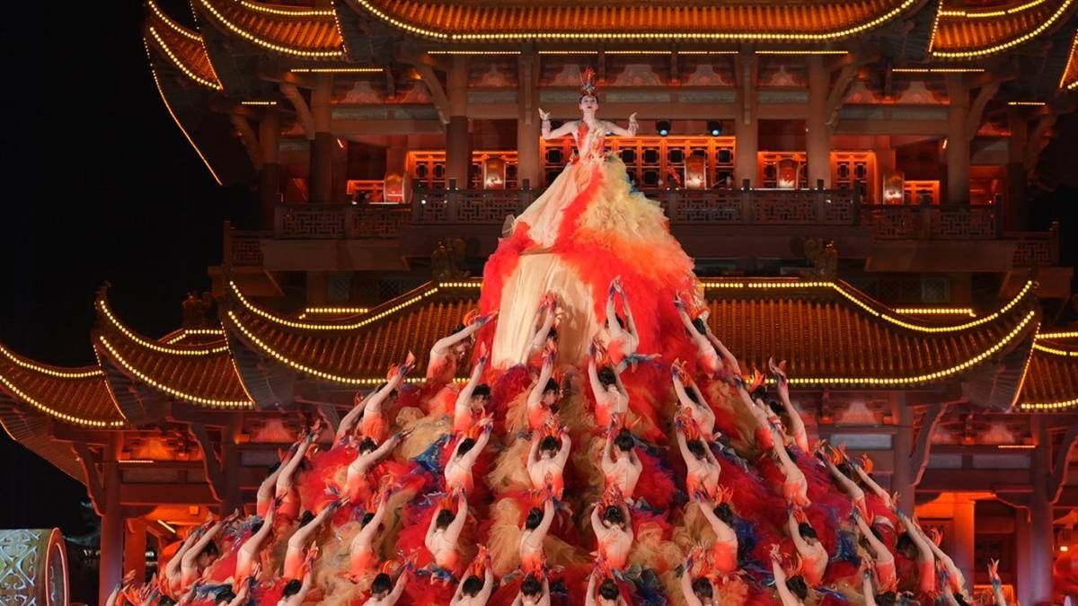 节目渐进高潮尾声,黄鹤楼上,鼓阵齐鸣,凤凰图腾涅槃重生,见证着千年古城在新时代的浪潮下的时尚蜕变。整个舞台像层叠的“蛋糕”塔,6余米高,演员们一层层围绕着中心主演舞动。