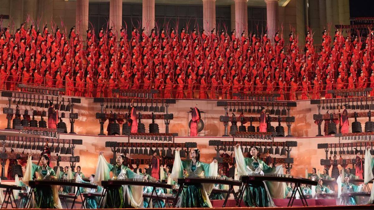 随着大气磅礴的楚乐合奏,舞台顶层的350余位舞者执羽而舞。执羽舞是中国古代舞蹈中的一种,源自周朝时期,主要用于教育贵族子弟,同时也是皇家祭祀或接待他朝使节的重要舞蹈。“执羽舞演员手中的翎子,以及古筝演员头饰等,都是取样于博物馆中的荆楚文化符号。”
