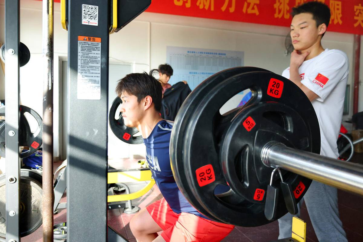 省游泳队运动员易甘权在训练杠铃负重课目。