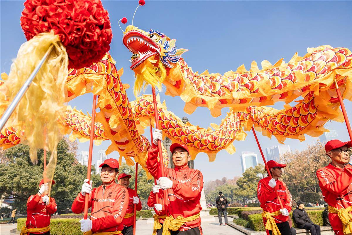 1月29日,大年初一,武汉中山公园上演轮滑舞龙、高杆龙等精彩民俗活动,吸引众多市民游客观看,品味非遗民俗文化。