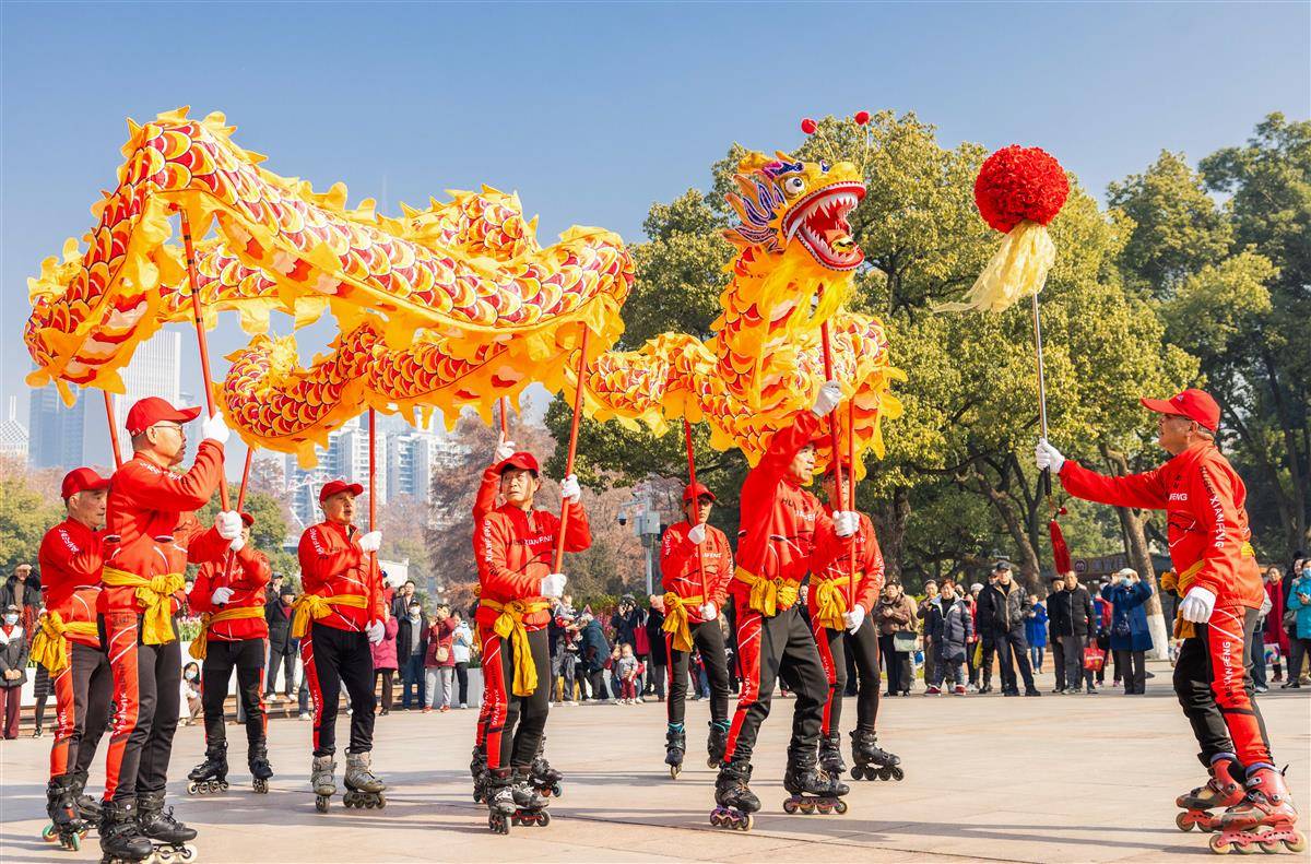 1月29日,武汉中山公园上演轮滑舞龙等精彩民俗活动,吸引众多市民游客观看。