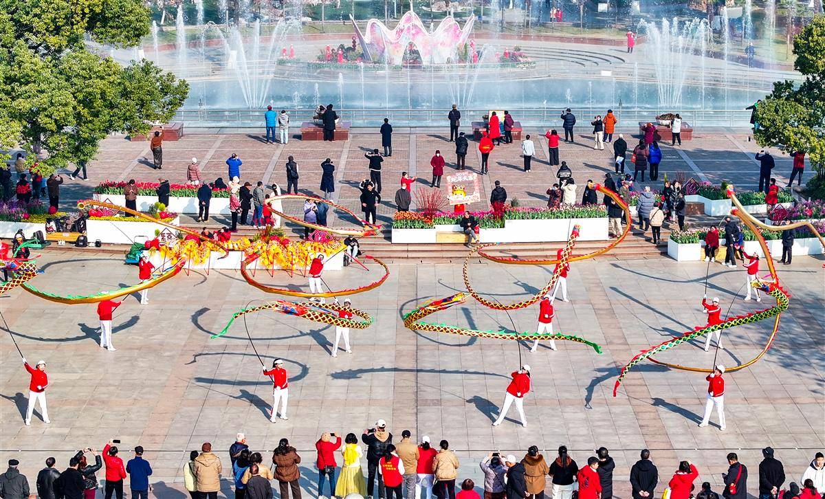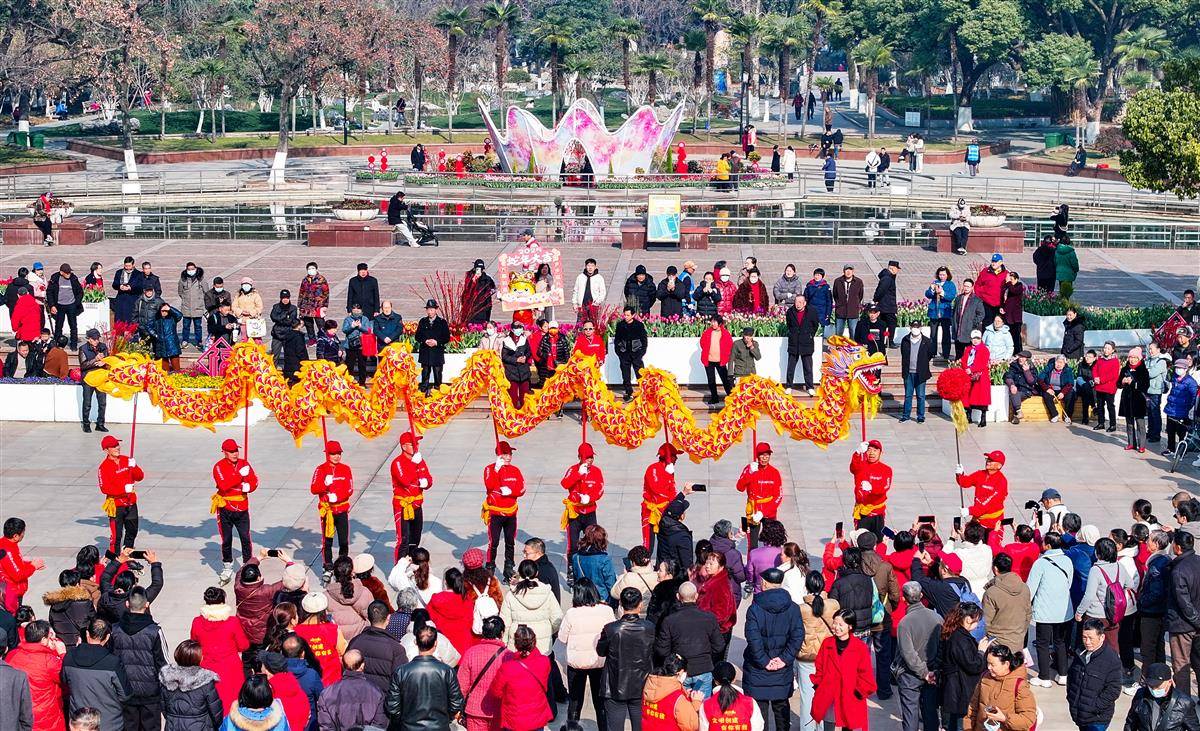 1月29日,武汉中山公园上演高杆龙等精彩民俗活动,吸引众多市民游客观看。
