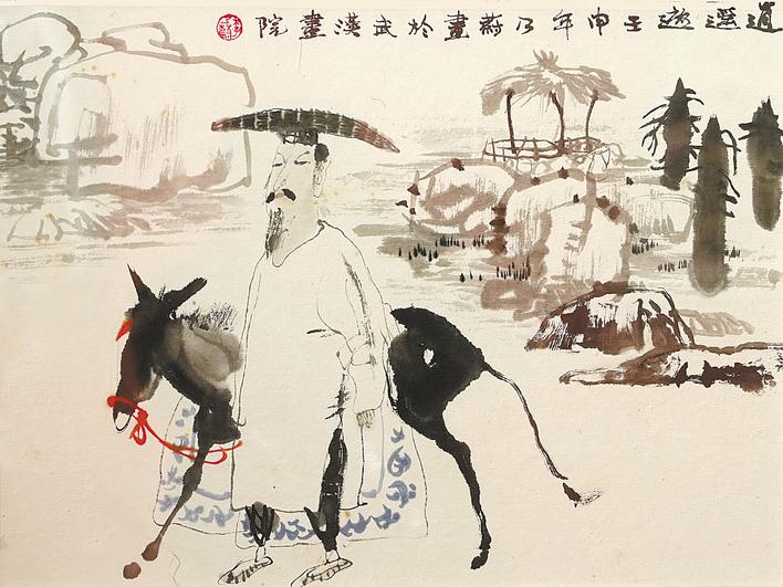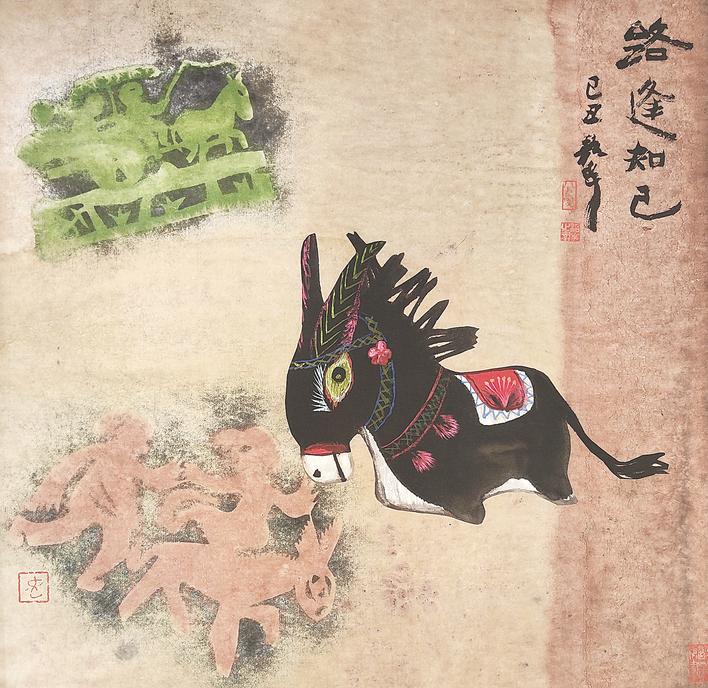 周韶华此次在画展上展出的作品为《路逢知己》。与平时我们所见到的大山、大水的周韶华不同,《路逢知己》表现的题材从自然走进了室内,从大场景变成了小局部,周韶华对民间的布艺驴玩偶进行了改造和重组,把民间艺术元素与当代艺术结构造型连接起来,使中国绘画形成一种独特的结构和新的图像符号。据了解,《路逢知己》是周韶华“国风归来”系列的创作。这个系列以吸收民间艺术元素,回望中国传统文化为特色。周韶华对“国风归来”系列的解读是:“拿民间艺术元素充实中国画,就是给中国画造血。”