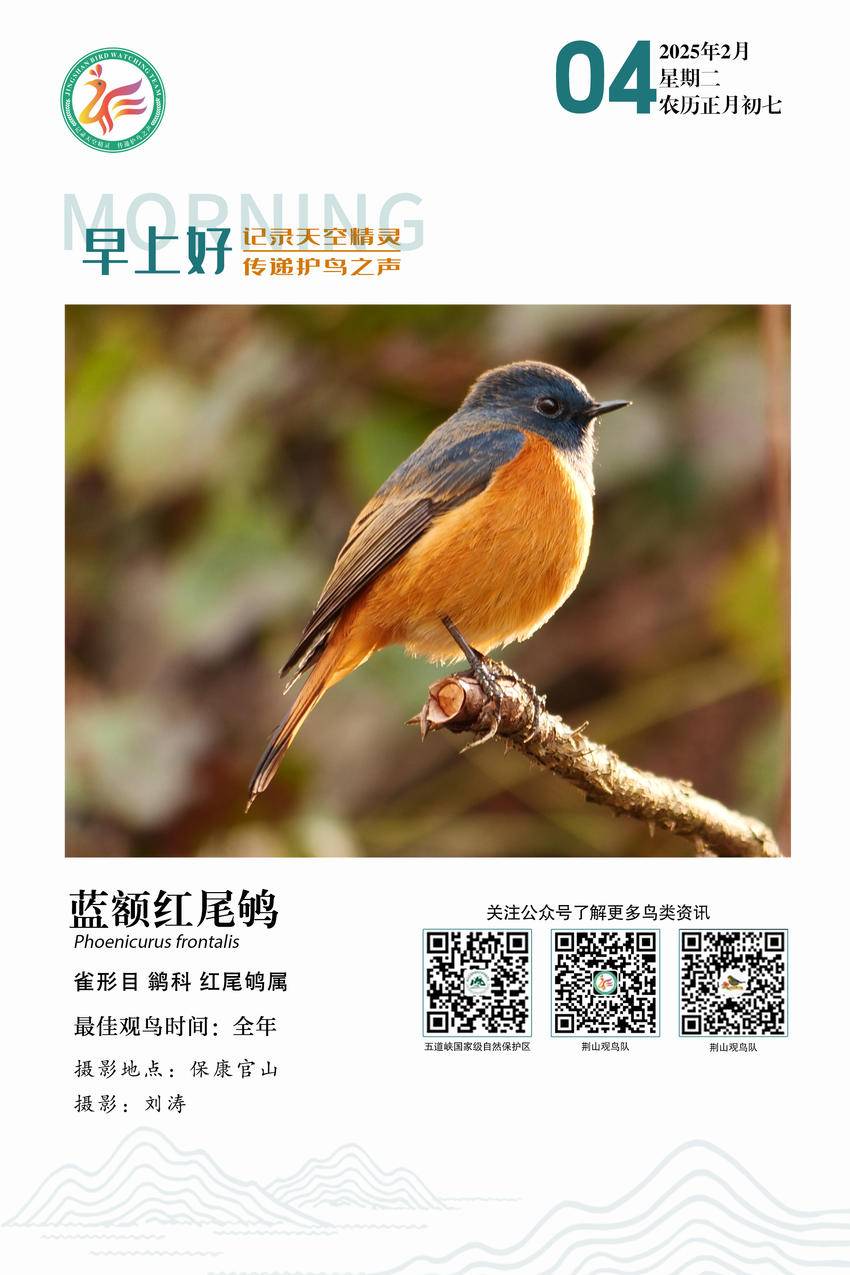 蓝额红尾鸲(qú)(英文名:Blue-fronted Redstart,学名:Phoenicurus frontalis),是雀形目鹟科红尾鸲属的鸟类。以其独特的橙色胸部、腹部和尾巴以及超蓝宝石般的头部和背部而著称。雄鸟色彩鲜艳,雌鸟则呈棕色,尾部和下腹部橙色,尾羽上的黑色‘T’字标记独一无二。主要分布在中国西南部和喜马拉雅山脉,种群数量不多。栖息于亚高山针叶林、高山灌丛草甸,冬季下移至中低山地带。活动范围广泛,包括溪谷、林缘灌丛、农田、茶园和居民点附近。以昆虫为主食,偶尔摄取植物果实和种子。(来源:湖北五道峡国家级自然保护区管理局)