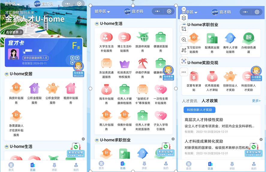 积极拓展“宜才码”平台功能,重构区县服务版块,创新打造“金猇U-home”一站式人才服务体系,集成市区人才服务项目33个,新增购车补贴等区域特色服务项目14个,实现服务项目“一站集约”“一码通办”,累计回应解决人才即知即办事项1200余件,处理线上人才服务申请2695人次,较去年同比增长47倍。“宜才码”平台新增注册2974人,注册量较去年同比增长27.8%。