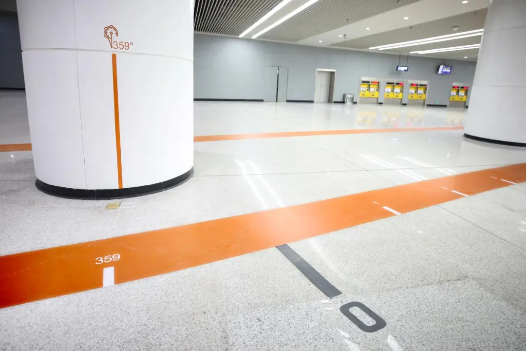 光谷广场站整体呈圆形布局,传统的‘左转’或‘右转’指引方式在这里并不适用。该站指引标牌上标注了0°至359°的角度范围,其中0度为正北方向。乘客可根据目标方向查找相应的度数范围,快速找到出口。例如,若乘客需要从L出口出站,可找到标注为“70°-100°”的区域,沿着地面指引线前行,即可到达目的地。