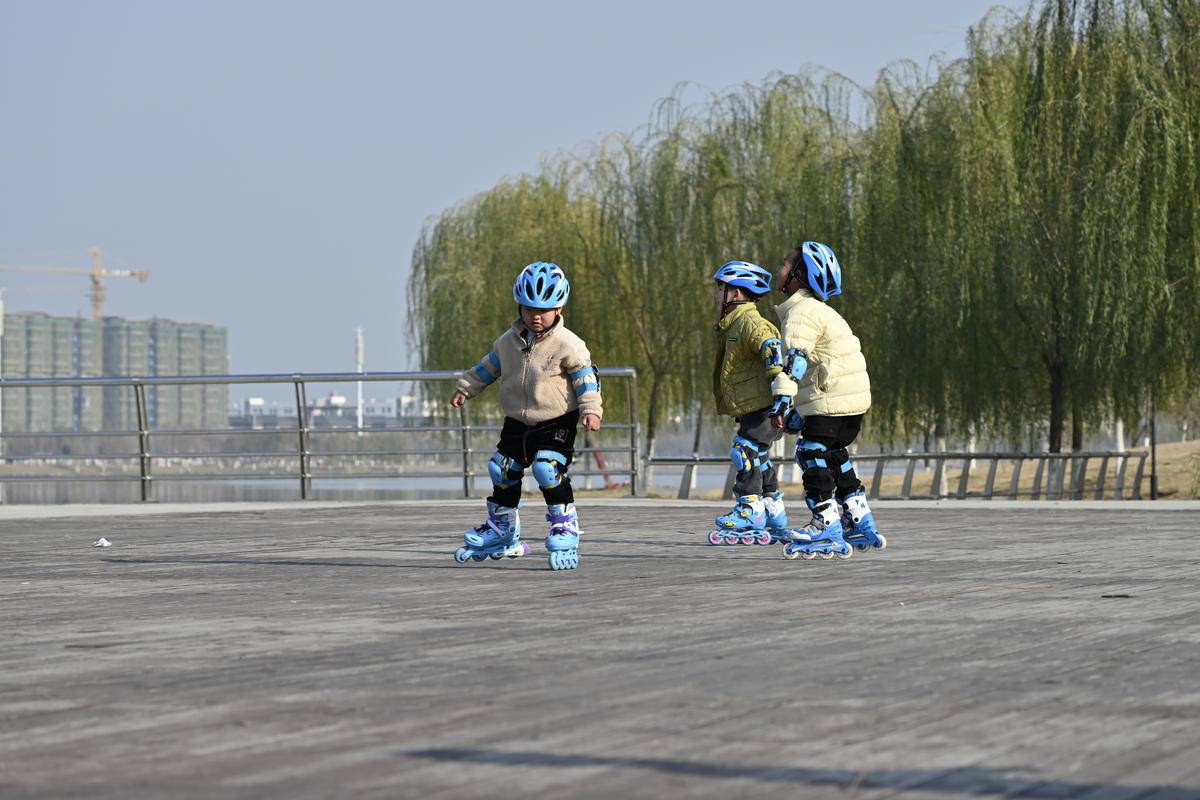 冬日暖阳下,天门北湖公园湖光水色两相和,呈现出五彩斑斓的独特风景,前来健身游玩的市民络绎不绝。