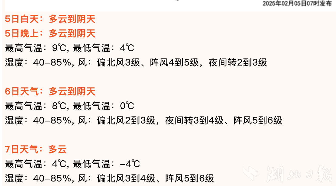 湖北日报讯(记者汤炜玮、通讯员陈声超)2月5日从武汉市气象局获悉,预计武汉市6-7日,受高空平直环流和地面冷空气影响,武汉市云系较多、北风增强、气温下降。11-12日受高空波动东移影响,武汉市又有降水发生。