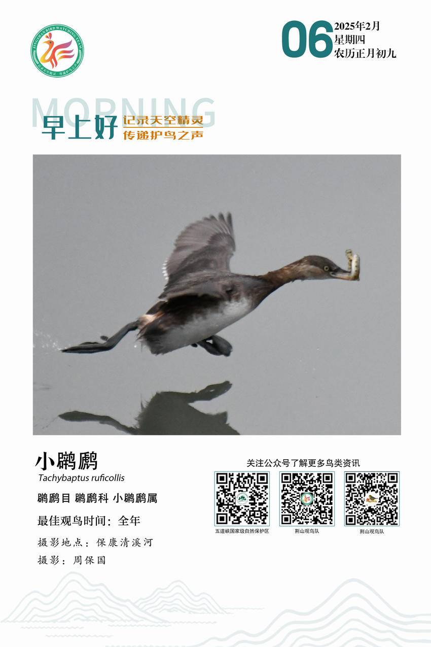 小䴙(pì)䴘(tī)(英文名:Little Grebe,学名:Tachybaptus ruficollis),是䴙䴘目䴙䴘科小䴙䴘属的鸟类。因颈部红色特征而得名,分布广泛,遍及欧洲(除最北端外)、亚洲大部分地区、菲律宾、非洲和马达加斯加等区域。小䴙䴘体型短小,羽毛绒密,外观似毛茸茸的葫芦,因此也有“水葫芦”“油鸭”等别称。栖息于清澈、生物丰富的湖泊、沼泽及水稻田,通常单独或小群活动。擅长游泳和潜水,能在水下追逐鱼和水生无脊椎动物。主要以小型鱼类、虾、昆虫幼虫、甲壳类、软体动物和水生植物为食。(来源:湖北五道峡国家级自然保护区管理局)