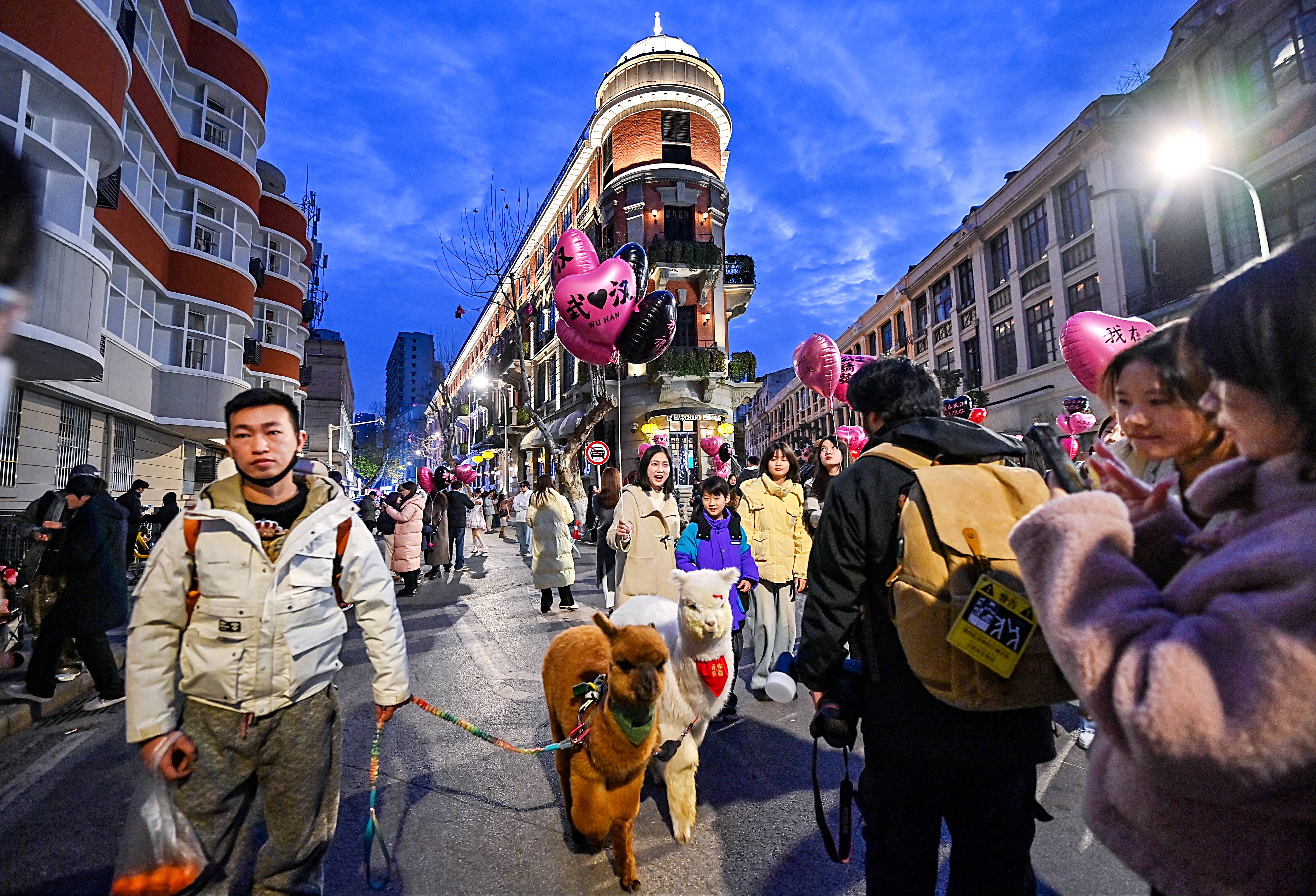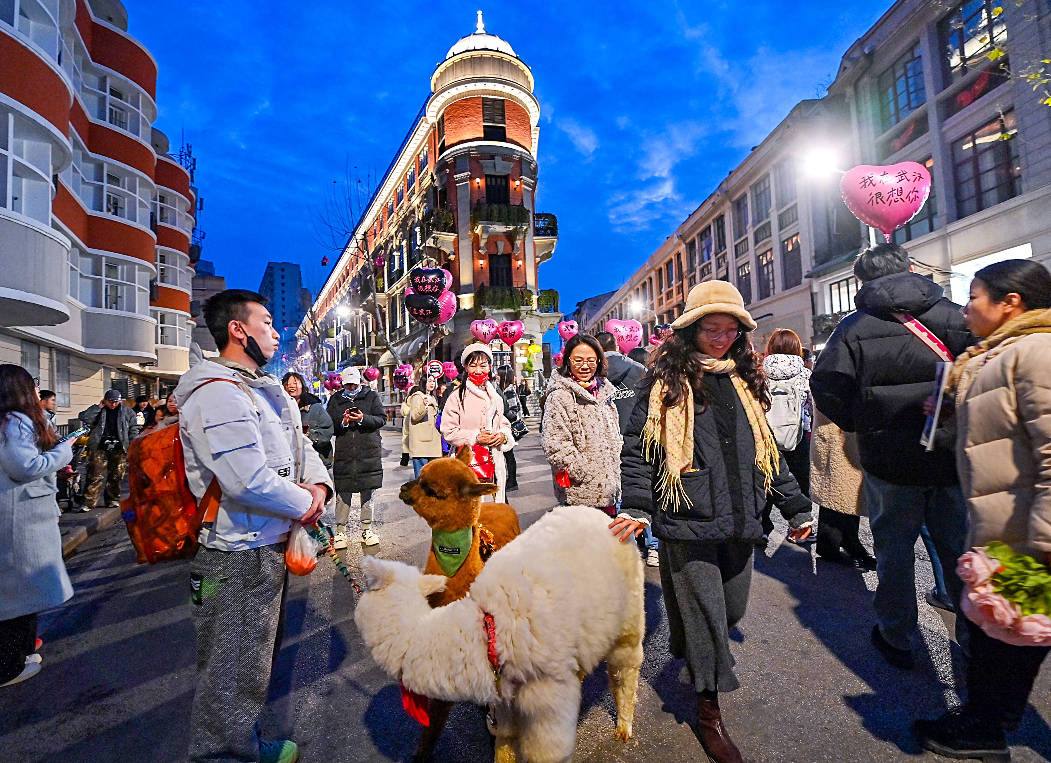2月6日晚,位于武汉汉口历史风貌区的江汉路、中山大道、黎黄陂路、巴公房子热闹非凡,尤其是巴公房子,这座历史悠久的建筑吸引了众多游客。拿着气球、捧着鲜花的游客在此留下一张张倩影。